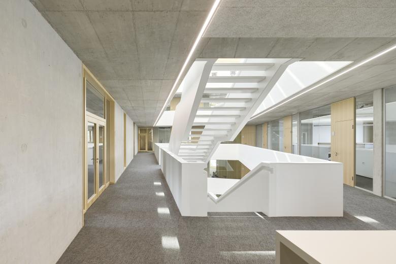 Die Bucher Automation AG bezieht 2024 ihren neuen Firmensitz im Technologiepark bei Marbach. Das Büro- und Verwaltungsgebäude umfasst eine angeschlossene Produktionshalle mit erhöhtem Lager- und Logistikbereich. Mittelpunkt des Bürogebäudes bildet das helle Foyer mit dem großzügigen Atrium. Als „Kommunikationsraum“ verbindet es sämtliche rundum angeordneten Bürobereiche über sieben Geschosse miteinander.