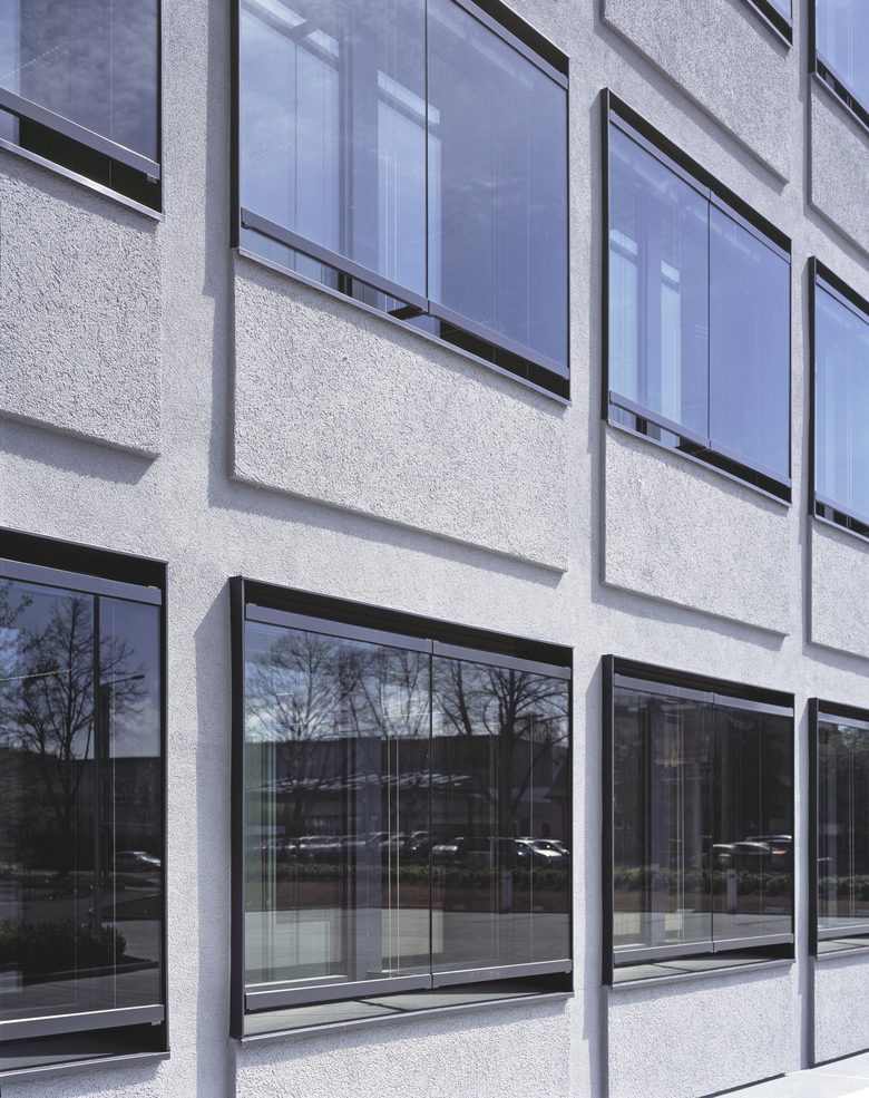 Fassade – Nach außen präsentiert sich das Gebäude in strenger Formensprache, die durch Fensterbänder – nach Norden als außenbündige Verglasung, nach Süden zur Straße als Kastenfenster mit vorgehängter Schallschutzverglasung – unterstützt wird. Die Fassade des Bestandsgebäudes wird unter Erhalt der ursprünglichen tektonischen Erscheinung dem technischen und funktionalen Standard des Neubaus angeglichen.