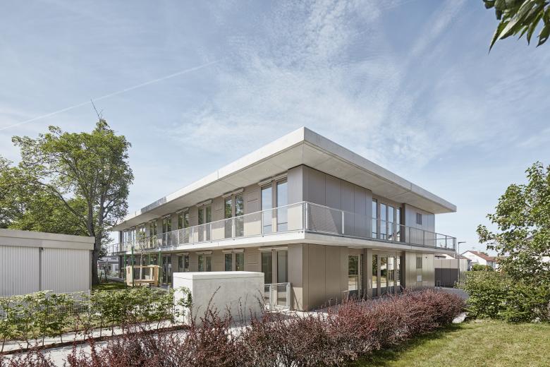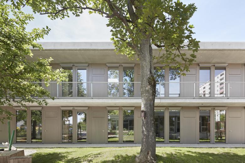 Gebäude – Die Außenerscheinung der zweigeschossigen KITA wird von der Einheitlichkeit der Fassadenbekleidung und Fenster in vorvergrautem Lärchenholz geprägt. Aufgrund des einheitlich durchgängigen Fassaden-Gestaltprinzips und Materialität der Baukörpergestaltung bewahrt sich das Gebäude eine Eigenständigkeit innerhalb der umgebenden Wohnbebauung. Die Materialität des Außenraums setzt sich beim Innenausbau und dem zentralen Spiel- und Erschließungsflur fort. Besonderes Augenmerk liegt auf dem Erhalt der Eigenwertigkeit der verwendeten Materialien: Unbehandelte Holzoberflächen und sichtbar belassene Betonbauteile bieten differenzierte haptische Qualitäten. Für sich wandelnde Konzepte in der künftigen Nutzung bildet das Materialkonzept einen robusten Rahmen.