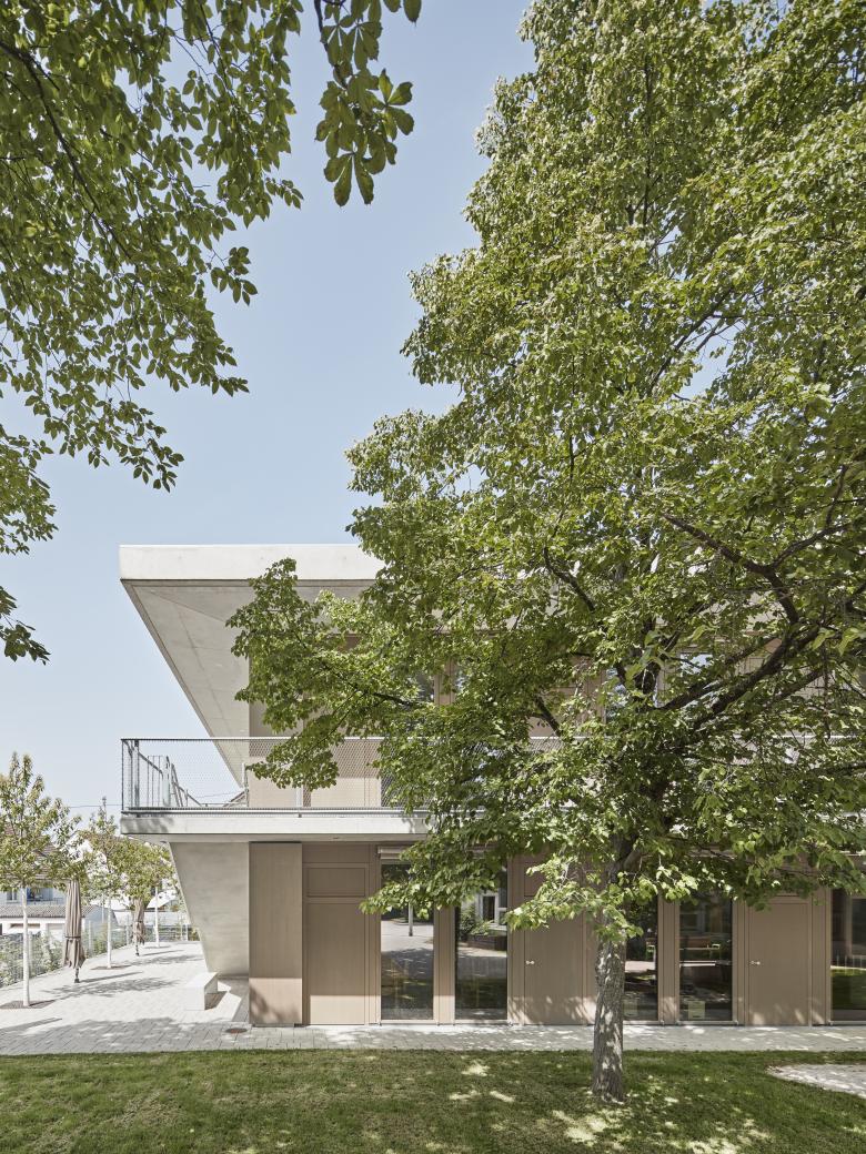 Energiekonzept – Die prägende kompakte Kubatur und ein energetischer Standard über den aktuellen Vorgaben bilden die Basis für einen energieeffizienten Betrieb. Die Gebäudedämmung ist mit Holzfaserplatten, die Massivbauteile sind in RC-Beton ausgeführt. Die Wärmeversorgung erfolgt über das im Aufbau befindliche Nahwärmenetz (BHKW). Ergänzt wird das Energiekonzept durch die vorgesehene großflächige Photovoltaikanlage auf dem dafür vorbereiteten Gründach.