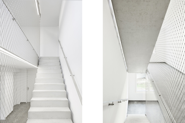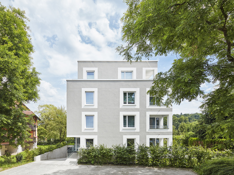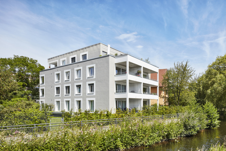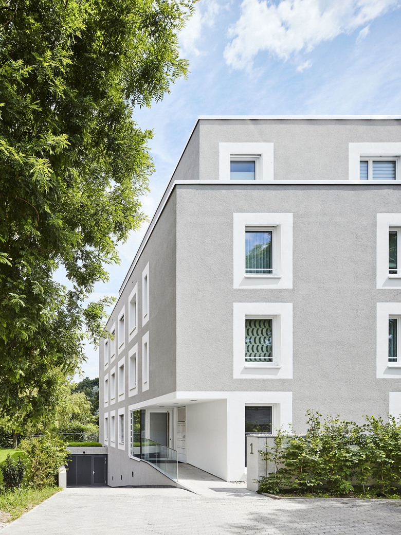 Außenräume – Im Gegensatz zu den umgebenden Wohngebäuden wurde der ruhende Verkehr nicht in halbabgesenken unattraktiven Garagenhöfen platziert, sondern in einer vollversenkten Tiefgarage. Somit wird die Beeinträchtigung und Versiegelung der Außenräume auf ein Minimum beschränkt. Die Tiefgarage wurde so konzipiert, dass an sie im zweiten Bauabschnitt direkt angeschlossen werden kann und keine zusätzlichen Rampenbauwerke erforderlich werden. Durch die Platzierung des 3 ½-geschossigen Baukörpers mit der Schmalseite zur Lotthammerstraße bleibt der räumliche Bezug zwischen dem Ortskernrand und dem südlich angrenzenden Grünraum zum Fluss und Grünzug erhalten. Die in den Baukörper integrierte überdachte Erschließung des Gebäudes erfolgt von der Lotthammerstraße auf der Nordostseite. Die privaten Freiräume befinden sich auf der Süd- und Westseite. Sie sind mit sichtgeschützten Loggien sowie linearen Begrünungselementen räumlich abgestuft und über großflächige Verglasungselemente und Schiebetüren mit den jeweiligen Wohnungen direkt verknüpft.