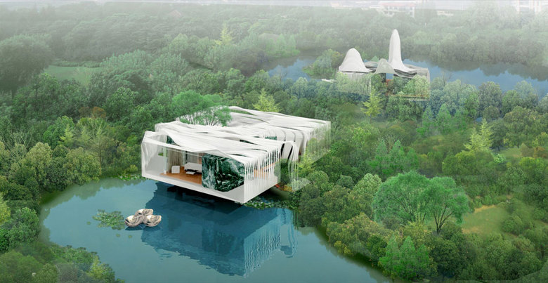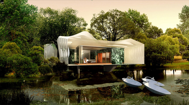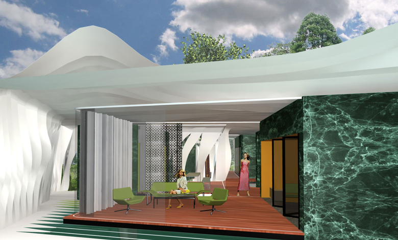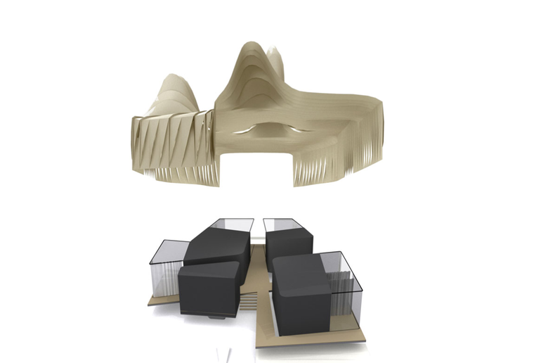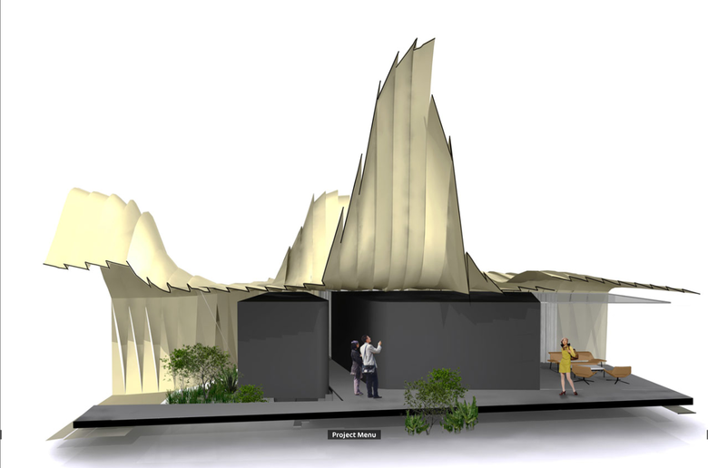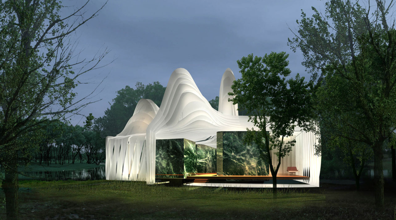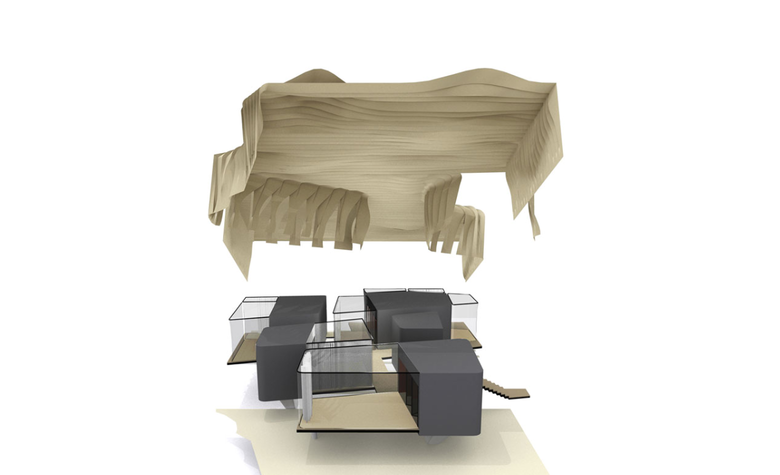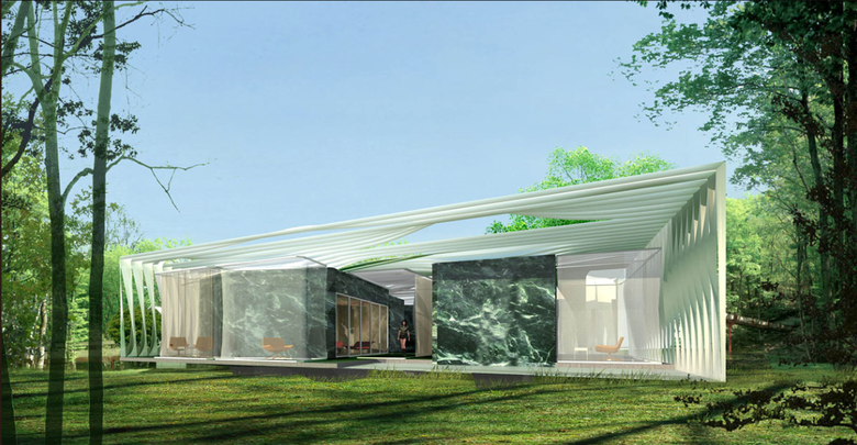 While providing an expansive outdoor living deck that spans the whole of the site, the primary living space is concentrated inside cooled zones. A maximum amount of economical and energy efficient floor area is created and sheltered from the elements by a dynamic tensile structure. The traditional relationship between indoor and outdoor has been shifted, allowing for comfort while free of the bonds of traditional walls.