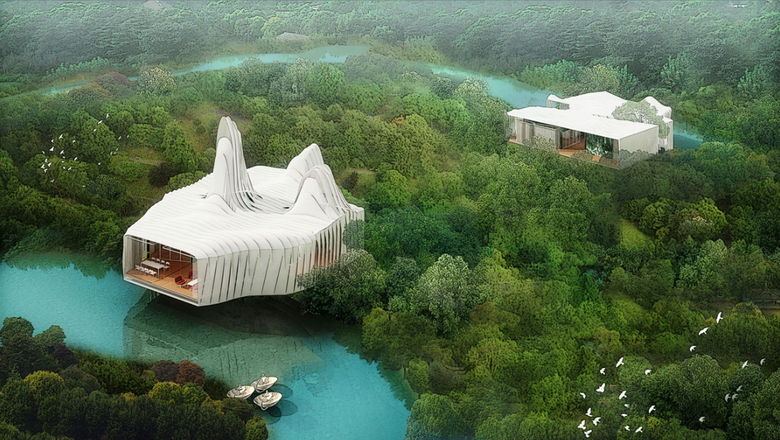 Extended living spaces are arranged separately from each other and bisected by landscaped areas with local vegetation. The surrounding tensile fabric flows through the interior, shaping and imbuing the spaces with sublime shading and view patterns. Heavy sliding curtains enclose living spaces and create privacy.