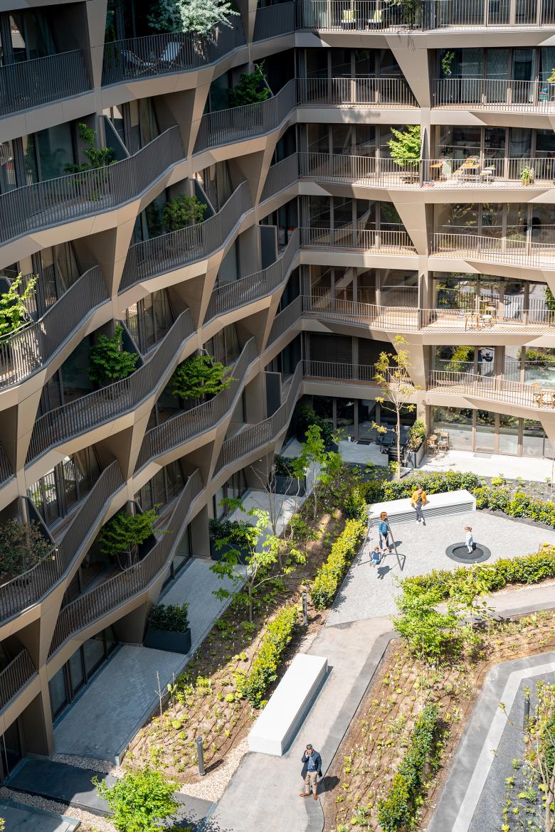 Building A accommodates an Apartment Hotel and lobby together with retail units on the ground floor, as well as apartments situated in the side wing, opening up to the courtyard.