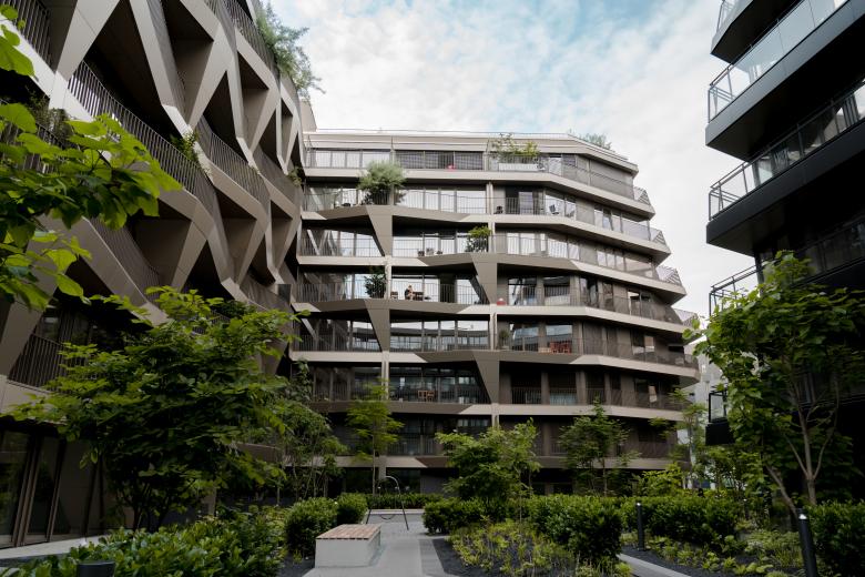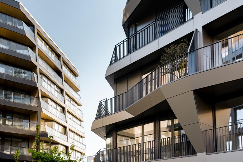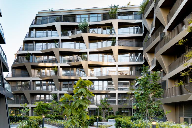 Building C, the third central structure, detaches itself conspicuously from the typological regularity due to its unexpected interwoven sculptural balcony structures. The triangular balcony areas change their orientation alternately per floor, thrusting every second floor off the façade so that the overlying balcony recedes thus creating a terraced feeling. Attached to the verticals are tree troughs, there to create a sphere of privacy. The trees appear to climb up the façade, perpetuating the green character of the inner courtyard with the outer walls.