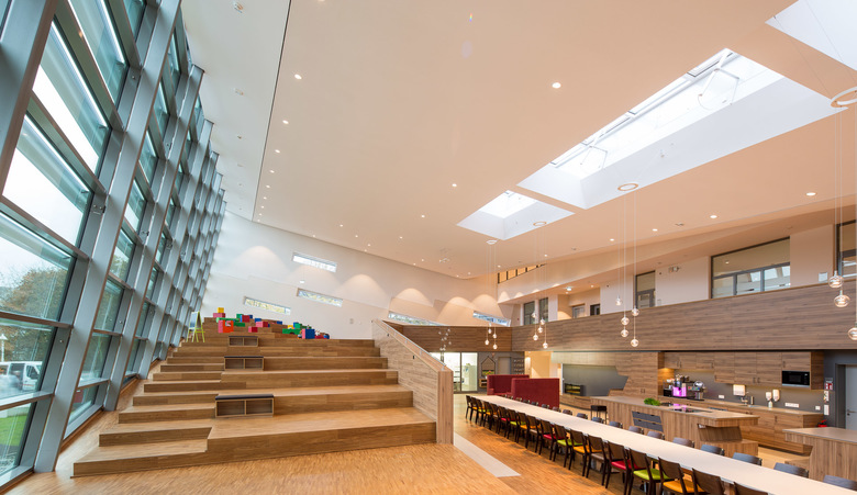 This central area also has an elongated interactive ramp. This ramp has many community uses, such as a landscape with spaces for sitting and lying down, a playground for children, a performance stage, and quiet working areas for parents. It also connects the interior community spaces with a large outdoor terrace.
