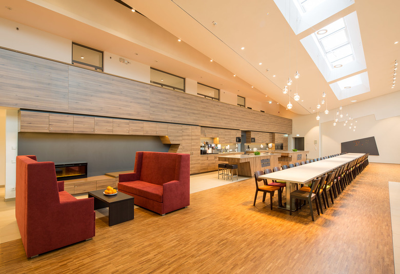 On the ground floor, a long table centrally located in the public area serves as community space for the entire house. It is here that parents find the opportunity to engage in conversation with each other while preparing meals together, thus creating a reciprocal sense of support and understanding.