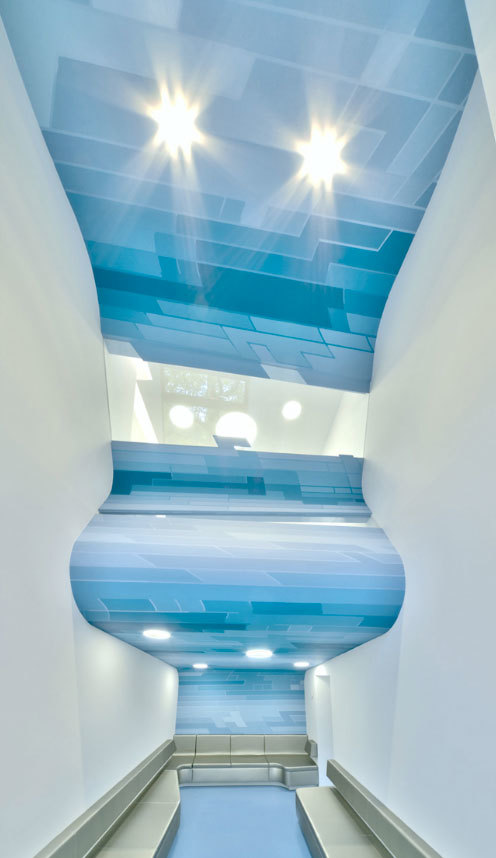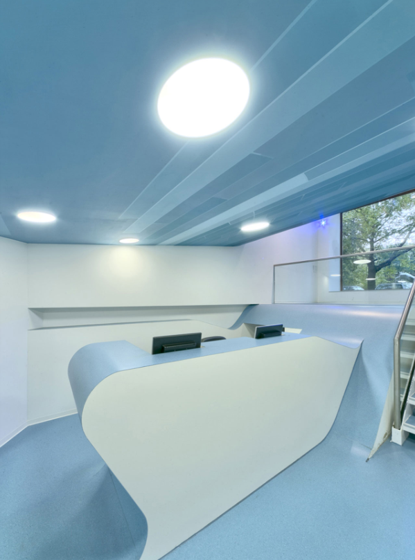 Gleich am Eingang der Praxis von Dr. Mokabberi staunen Kinder und Eltern vor einer sich aufbäumenden Welle, die durch das gesamte Gebäude fließt und dabei die Funktionen von Decke, Wand, Counter und Sitzlounge übernimmt. Es entsteht so ein Raumgefüge, bei dem die Räume durch die Gestik der Welle ineinander verwoben werden. Die Ausbildung von Splitlevels lässt einen beim Eintreten unter die Welle tauchen und jeder Patient wird sogleich in die Unterwasserwelt gezogen, die durch wandfüllende Grafiken eine atemberaubende Atmosphäre erzeugt. In allen Bereichen der Praxis ist das Thema präsent und wird durch den spezifischen Einsatz von Licht und Materialien erlebbar. Das Lichtkonzept unterstreicht den Eindruck der Unterwasserwelt durch Lichtpunkte die wie Luftblasen die Decke bespielen. In der gleichen Art wie die Welle sich durch die Räume zieht, ist ein Farbkonzept in Ozeanblautönen für die Praxis entwickelt worden, dass sich über die Decken, Wände, Fußböden auf die Möbel und Zahnarztgeräte zieht. Die grafischen Arbeiten von Strauss + Hillegaart ergänzen und vervollständigen das Bild der Unterwasserwelt. Bis ins kleinste Detail wurde das Konzept ausgebaut und verwirklicht und ermöglicht dadurch, dass die kleinen Patienten in die Unterwasserwelt versinken können und der Besuch beim Zahnarzt zu einem besonderen Abenteuer wird.