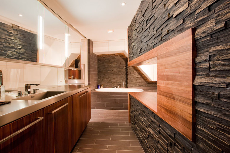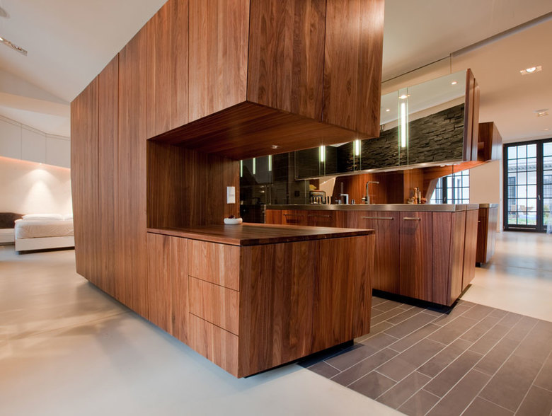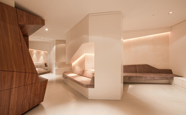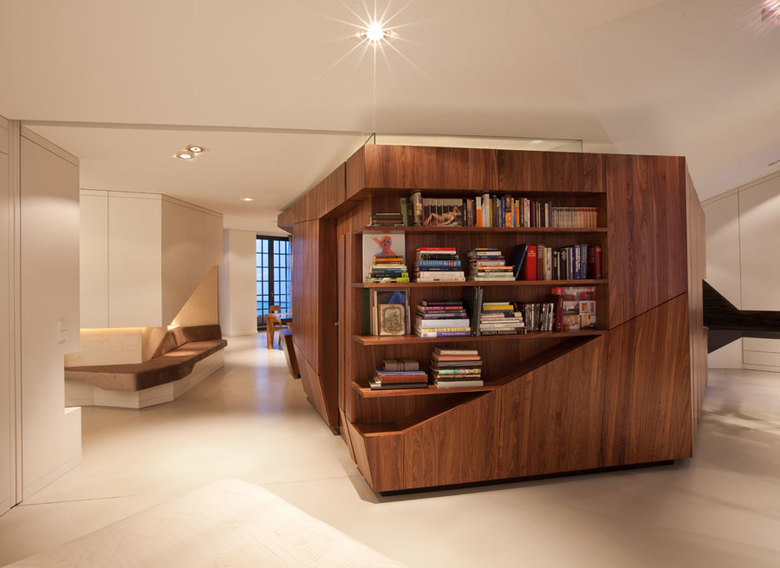 Flanking the walnut core, are the service walls contrasted in white. These walls house the rest of the functional elements of the space, positioned within niches to allow flexible spaces to exist for working, relaxation, bathing and sleeping. Flexibility in design was achieved through the use of ceiling-high, room-dividing sliding walls, allowing for multiple configurations of public and private space within the loft. The sliding walls, when retracted, are completely concealed within the service walls.