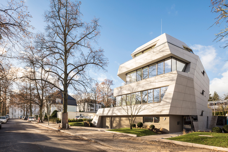 GRAFT’s design for a private villa in Berlin’s venerable Grunewald quarter presents a striking, modern interpretation of comfortable living in the city. It’s trapezoidal, sculptural form and modern architectural language symbolizes a boulder in a glacial landscape and differentiates it from its neighbours. The distinctive, three-dimensional figure of the four-storey building appears to rise out of the ground. For its design, GRAFT abstracted the classical rules of villa design and digitally synthesized them with natural phenomena shifting the tectonics of a villa towards those of a sculpture.