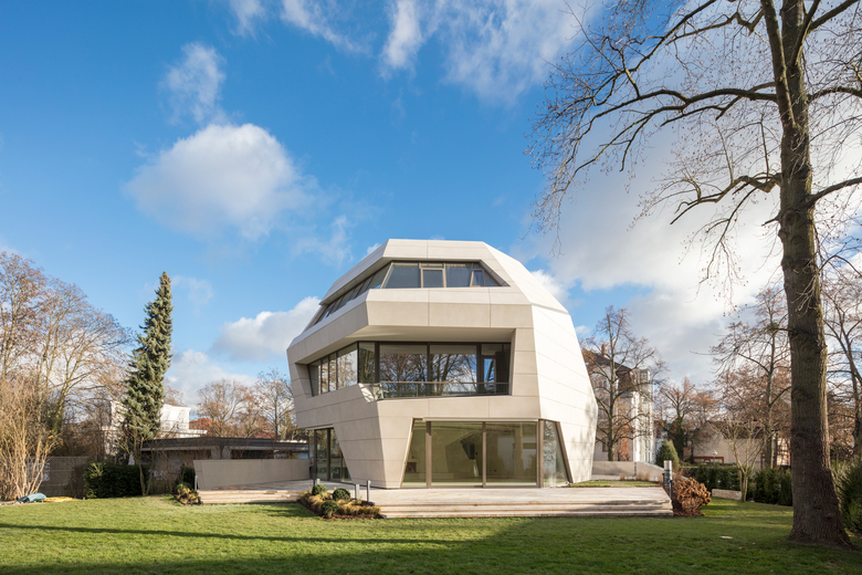 The façade is clad with ceramic plates that reinforce the impression of a large stone boulder. Horizontal incisions in the faceted surface of the façade for the loggias and floor-to-ceiling glazing are strategically placed to establish visual connections with the surrounding greenery while maintaining privacy. This asymmetrical appearance is reflected in the interiors where flowing transitions between the rooms create a sense of openness. The internal stairs and fireplace, in particular, break with residential design conventions. The centerpiece of the house is the living room, a prismatic, spacious open space designed for maximum comfort.