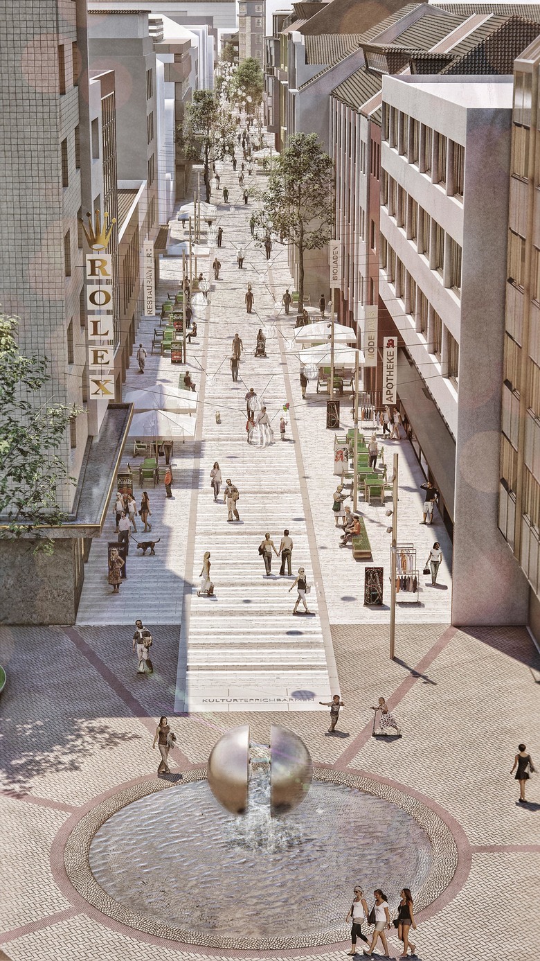 In unserem Gestaltungskonzept interpretieren wir die Barmer Innenstadt als „Urbanes Theater“, dessen Stadträume in Form von unterschiedlichen „Szenographien“ abwechslungsreich programmiert und bespielt werden können. Der „Alte Markt“ und der „Platz an der Werther Brücke“ bilden dabei die Haupteingänge und „Foyers“. Der „Johannes-Rau-Platz“ und der „Geschwister-Scholl-Platz“ sind als „große und kleine Bühne“ die urbanen Spots für Märkte, Feste und Veranstaltungen. Der Werth bildet als „Laufsteg“ das verbindende, lineare Rückgrat innerhalb dieser spannungsreichen Platzfolge. Die Querstraßen des Werth werden durch die punktuellen „Satelliten“ angebunden, die die „Nebeneingänge“ zur Innenstadt markieren. Das Besondere an unserer Idee: Durch computergesteuerte Lichtprojektoren soll der steinerne Kulturteppich und die Fußgängerzone durch ein komponiertes “Lichtdrehbuch” je nach Nutzung und Tageszeit in ganz unterschiedliche Atmosphären getaucht werden. Die Innenstadt wird zum “urbanen Theater” mit vielfältigen Szenographien.