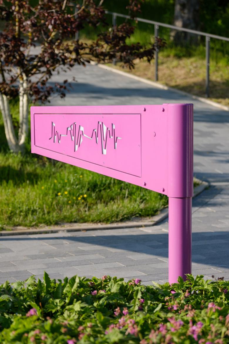 Die durchgehend und einheitlich gestaltete Nord-Süd-Achse verbindet die Landschaftskaskaden mit dem Zentrum und ermuntert die Nutzer:innen, diese Räume zu erkunden. Prägend für das Gesamtkonzept sind die Spiel- und Ausstattungsgegenstände sowie die Bepflanzung in dem von den Bürger:innen gewählten Farbkonzept in Violett. Um den Eindruck einer verbindenden Nord-Süd-Achse weiter zu stärken wählten wir ein einheitliches und signifikantes Bepflan¬zungskonzept.