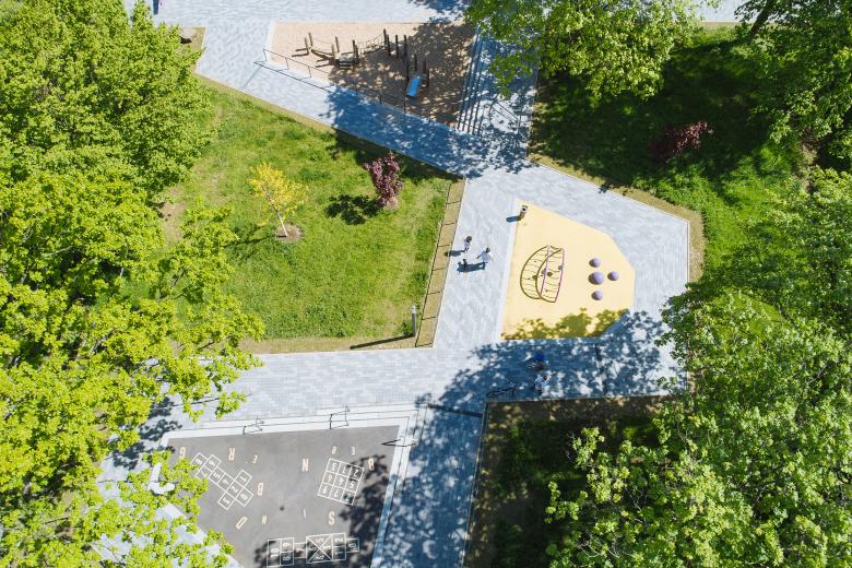 Durch den gewundenen Verlauf der Wegeführung entstand die Idee der „Landschaftskaskaden“. Diese legen sich als horizontale Ebenen in das geneigte Gelände und bilden ebenerdige Räume mit unterschiedlichen Atmosphären und Funktionen. Das Angebot von Ruhe bis Spiel und Austausch orientiert sich dabei an den Nutzungen der angrenzenden Bestandsflächen und reagiert auf diese. So bilden sich entlang der Nord-Süd-Achse neue zielgruppenorientierte Treffpunkte und Aufenthaltsräume. Ein Aussichts- und ein Aktionsplateau sowie Spielplätze und Vegetationsflächen wurden auf Bedürfnisse der jüngeren Bevölkerung ausgerichtet und angepasst. Ergänzt wird das Angebot durch Fitnessgeräte für die ältere Generation und im Zentrum durch eine Fahrradwerktstatt und eine Calisthenic-Anlage für Jugendliche. Die Außenanlagen des Schulhofs wurden mit den Schülern im Rahmen mehrerer Beteiligungsverfahren zusammen gestaltet.