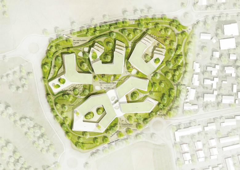 Begrünte Dachflächen, mit Sträuchern und Stauden bepflanzte Innenhöfe sowie Landschaftsterrassen, die vom Zentrum des Areals rund drei Geschosse hinableiten, ergänzen das grüne Konzept. Mit heimischen Gehölzen und Stauden fungieren sie als grüne Pufferzone zur benachbarten Siedlung und bieten sich den Mitarbeiter:innen zum Entspannen und Verweilen an.