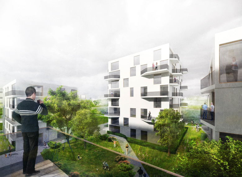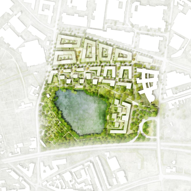 Unser Grundkonzept sieht eine attraktive Verbindung zwischen den neu entstehenden Gebäuden und den vorhandenen Natur- und Erholungsräumen vor. Die schollenartig und polygonal geformten Flächen bieten unterschiedlichen Nutzergruppen und Generationen abwechslungsreiche Kommunikations- und Verweilorte sowie Bewegungsmöglichkeiten an. Der wertvolle Baumbestand wird weitgehend erhalten. Durch gezielte und notwendige Auslichtungen sowie einiger Neupflanzungen wird eine Offenheit und Durchlässigkeit erreicht und der parkartige Charakter gestärkt. Die Sichtachsen, die den Charakter des Quartiers maßgeblich prägen, stellen einen Bezug zwischen den Wohngebäuden, dem differenzierten Grünraum und dem See her. Durch die gezielte Platzierung der Neubauten erhalten möglichst viele Wohnungen Ausblicke auf den Albertussee.