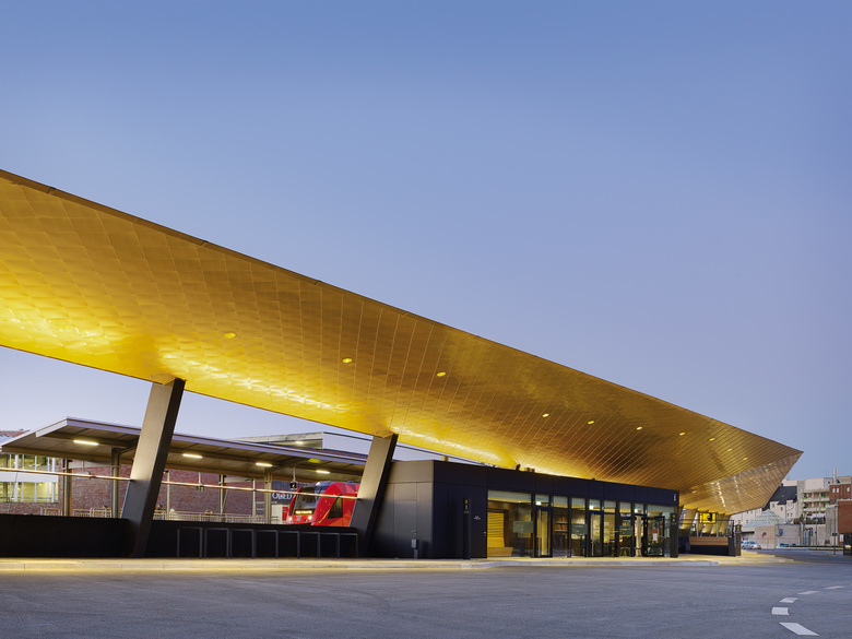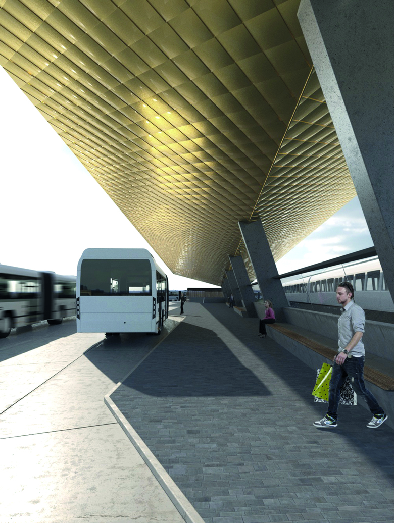 Die Umgebung des neuen Busbahnhofes in Gummersbach ist durch die markante Felshangsituation unterhalb der „kleinen Bergstraße“ räumlich geprägt. Die Architektur des polygonal gefaltenen Daches greift die gebrochene Struktur der Felsen auf und bildet ein markantes „Segel“. Dieses 130 Meter lange, 30 Meter breite und rund fünf Meter hohe Dach glänzt bei Sonnenschein golden und formt das neue Entree am Busbahnhof. Zudem fasst es die ansonsten offene stadträumliche Situation und bietet einen atmosphärischen Ort zum Aufenthalt. Das polygonale Thema der großen und der kleinen Dächer wird in den Oberflächengestaltungen der Fußgänger- und Fahrflächen weitergeführt. Wesentliche Elemente des Freiraums sind dabei die beiden Bastionen aus Sichtbeton, die den Niveauunterschied zur Bahnunterführung formulieren und das Dach als starkes Fundament „tragen“.