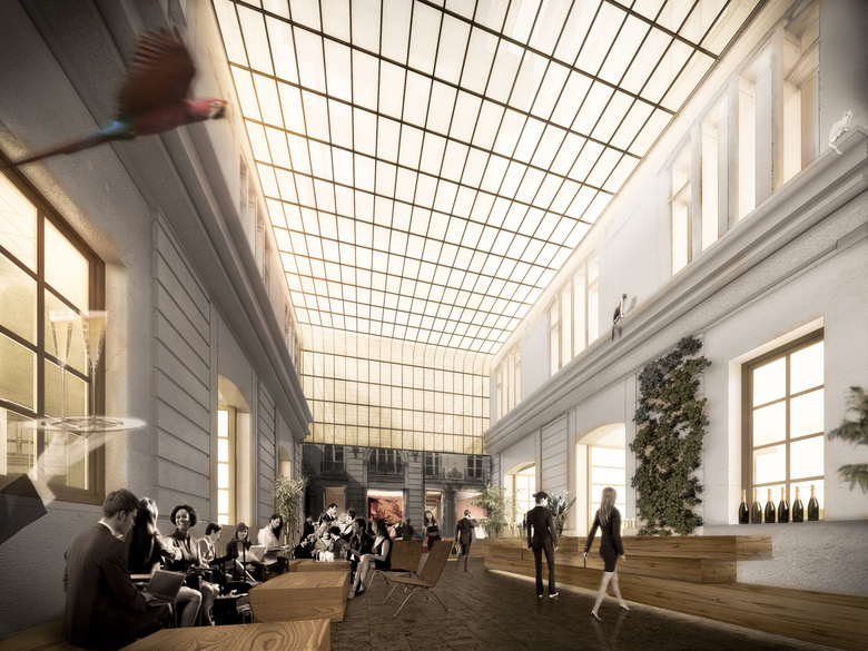 All the rooms are facing the passage with doors and windows (restaurant, bar, reception, library, hallways). They are the atmospheric content, they tell the story of Paris, full of life and passion. Like a writer or painter that strolls through the lively Paris old town and sees and hears all the colours and noises coming from the houses. Seduction: what is going on inside?