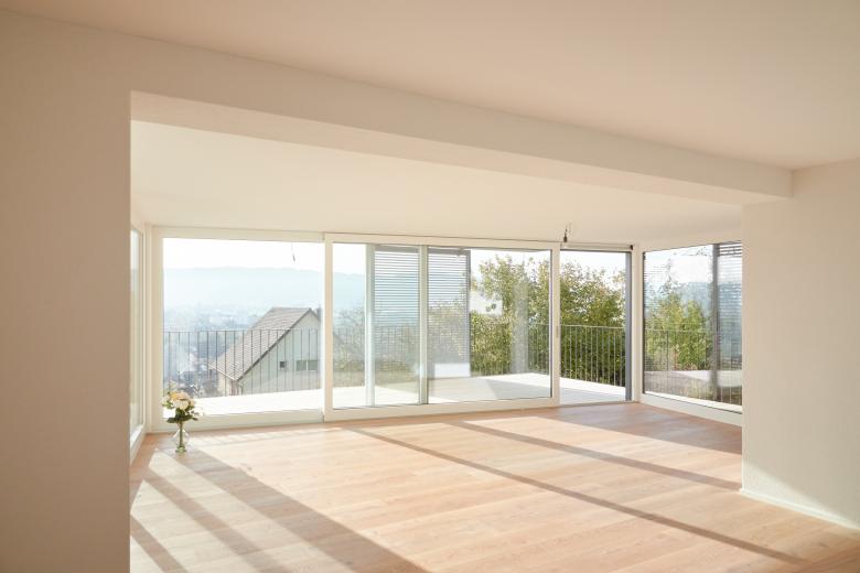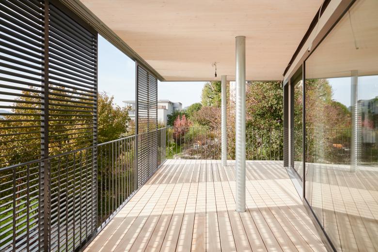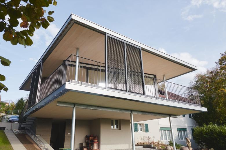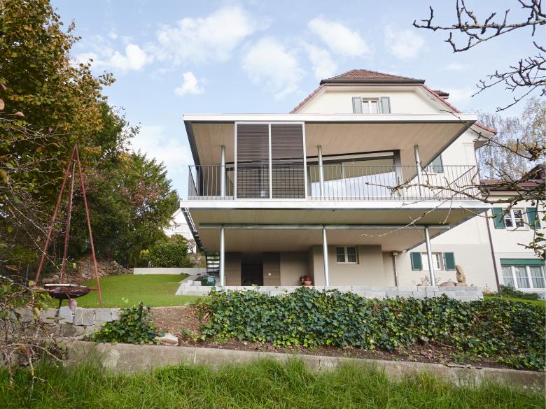 Hoch über Wohlen tront eine ältere Liegenschaft an einer aussergewöhnlich schönen Lage, jedoch mit einer für die Bedürfnisse der Bauherrschaft viel zu kleinen Wohnung. Das Konzept «fliegender Anbau» löst das Problem radikal: Alle Aufenthaltsbereiche werden durch grosszügige Verglasungen lichtdurchflutet und verfügen neu über eine wunderbare Aussicht. Der Innenraum wird durch die durchgehende Terrassengestaltung räumlich bis an die Schiebeläden erweitert. Als frei veränderbarer Filter von Licht und Sicht lassen sich mit ihnen geborgenere oder offenere Wohnstimmungen erzeugen.