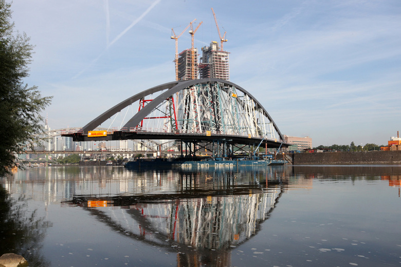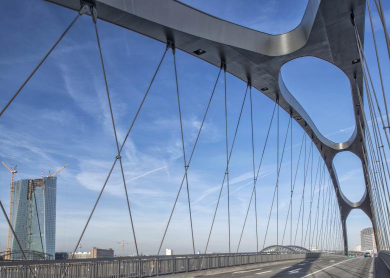 Die neue Mainbrücke Ost und die Honsellbrücke ergänzen sich zu einem harmonischen Ganzen. Das ursprüngliche Konzept von 1907 - mit Bogenbrücken über Hafenbecken und Fluß – wird mit einer zeitgemäßen Konstruktion umgesetzt. Der Bogen als signifikante Konstruktion weitgespannter Tragwerke im Osthafen wird anderen Konstruktionsmöglichkeiten (Schrägseilbrücke, etc....) bewusst vorgezogen. Form, Struktur und Materialität der Brücke suchen einen Einklang mit dem Ort, der Honsellbrücke und dem berühmten Schalendach der Elsässer-Großmarkthalle. Die neue Brücke ist weniger ein Bauwerk, das sich in den Vordergrund spielt, als vielmehr ein Baustein eines selbstverständlichen Ensembles des industriell geprägten Ortes. Als Materialien kommen bei der Vorlandbrücke Basaltlava, bei den Brückenköpfen der neuen Brücke roter Mainsandstein zum Einsatz. Die durch die Demontage gewonnen Formsteine und Reliefplatten aus Basaltlava werden allesamt im neuen Rampenbauwerk wieder verbaut. Die neue Mainbrücke wird in schwarzem Stahl ausgeführt. Mit der Mainbrücke Ost werden zwei attraktive Uferzonen und Stadträume über den Main hinaus vernetzt. Dem Radfahrer, der das Mainufer täglich als Radweg durch die Stadt nutzt, aber auch dem Wochenendflaneur entlang des Flusses werden Wege angeboten, die nicht nur kurz und funktional sind, sondern die vor allem räumliche Qualität bieten. Der spektakuläre Ausblick auf die Skyline findet Ausdruck in dem Angebot von „Stadtterrassen“ auf den Brückenköpfen und schönen breiten Treppenaufgängen mit Verweilqualität. Eine besonders attraktive Verbindung beider Uferbereiche entsteht dadurch, dass bei der neuen Brücke Geh- und Radweg konsequent durch eine Fuge von der Straße getrennt sind.