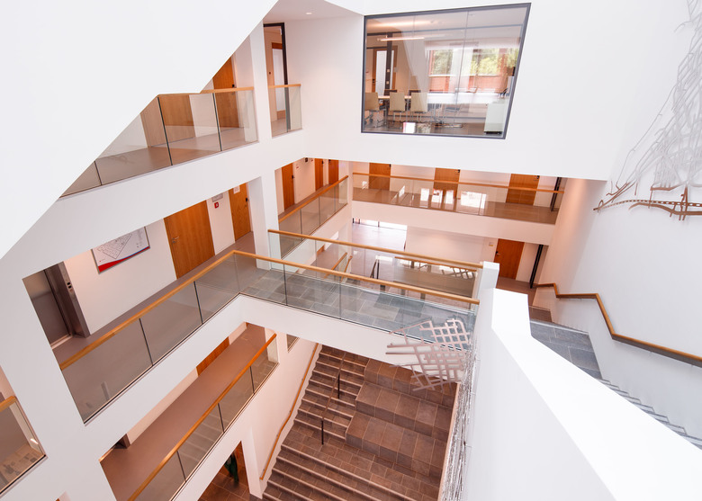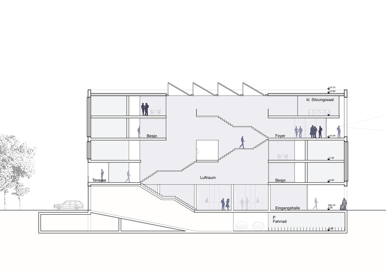 Als Reaktion auf die aktuelle städtebauliche Situation, aber auch um zukünftige städtebauliche Optionen offen zu halten, ist der Neubau von drei Seiten nahezu gleichwertig erschlossen: Einerseits über die östliche Arkade von Nord und Süden und anderseits im Westen durch das durch den Baukörper „gesteckte“ öffentliche Foyer. So findet der besondere öffentliche Charakter des Hauses Ausdruck in der Gestaltung einer offenen Halle, die alle Ebenen über eine elegante Freitreppe großzügig miteinander verbindet. Der Ratssaal liegt der Stadt zugewandt an exponierter Stelle an der nordöstlichen Ecke im 4. OG. Eine eigene, kleine Foyerzone vor seinem Eingang und eine rückwärtige, bedienende Zone ermöglichen einen funktionalen Betrieb. Als besondere Qualität des Saales wird nicht nur ein hoher, zweigeschossiger Raum (Lichte ca 5,80m) angeboten, sondern auch ein hohes, großes Fenster zur Stadt und zum Schlosspark, dem eine repräsentative Stadtloggia vorgelagert ist. Die Räume des Bürgermeisters und seines Stellvertreters sind ebenso wie der Saal direkt an diese Stadtloggia und an das kleine Foyer angebunden. Die Organisation des Grundrisses folgt dem Ziel der Übersichtlichkeit und Funktionalität. Die einzelnen Abteilungen werden zusammenhängend und jeweils mit der Möglichkeit einer ringförmigen Erschließung aufgereiht. Die über alle Geschosse reichende Halle und ihre Freitreppen dient der übersichtlichen Erschließung durch Besucher, zwei notwendige Treppen Räume schaffen auf kurzem Wege die Entfluchtungsmöglichkeit nach draußen. Das „offene“ Haus ist der Idealfall einer einladenden Behörde. Dieser Charakter wird erreicht, indem keine geschossweisen Brandabschnitte gebildet werden, sondern das Haus wird zur Kompensation flächendeckend gesprinklert und mit einer Alarmierung versehen. Diese Lösung ist in Summe wirtschaftlicher als aufwendige Brandabschnittstrennungen und kann durch die Ansonsten sehr wirtschaftliche und kompakte Grundrissorganisation des Hauses ausgeglichen werden.