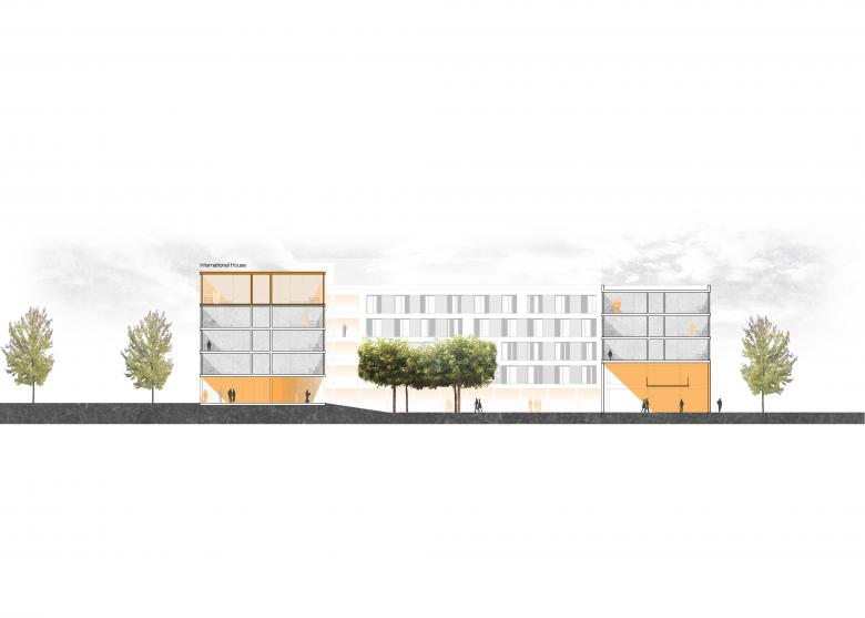 Trotz der vorgenannten besonderen Qualitäten sehen wir das International House als integralen Bestandteil des Hauses: Erschlossen wird es über den gleichen Haupteingang und die Kolonnade. Sollte eine von den Studierenden getrennte Vertikalerschließung gewünscht werden, könnte man mit einer Schlüsselschaltung im Aufzug das 4. OG einfach nur dieser Personengruppe zugänglich machen. In den großzügig ausgebildeten Erschließungszonen in den Innenecken könnte nach Wunsch und Erfordernis alternativ aber auch noch ein zusätzlicher Aufzug integriert werden, der nur in das 4. OG fährt. Ein eigenes Treppenhaus sollte nicht erforderlich sein, da man das 4.OG i.d.R. ohnehin nicht fußläufig erschließen wird.