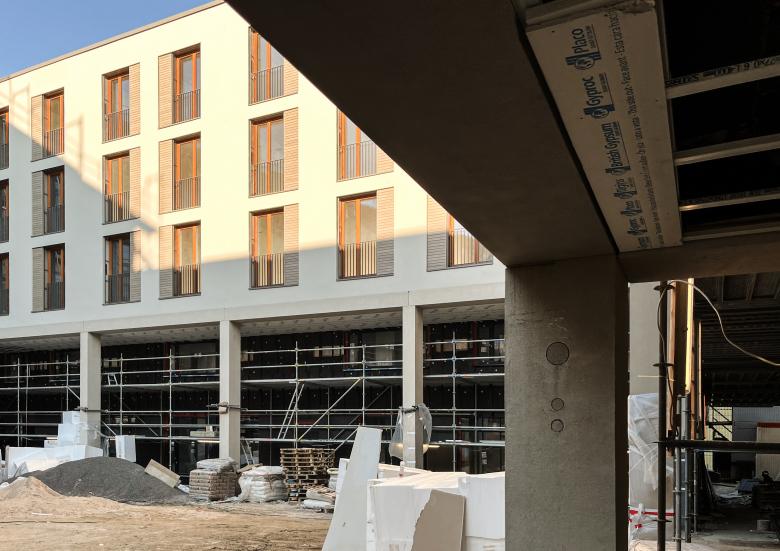 Mit dem Neubau des Studierendenhauses wird die nördliche Kante des Campus zur Riedberg-Allee gefasst. Der fünfgeschossige Baukörper orientiert sich mit seinem Kopf und Haupteingang sowie seinen öffentlichen Nutzungen zum Straßenraum. Gleichzeitig ermöglicht der u-förmige Baukörper über die gemeinschaftliche grüne Mitte dennoch eine Ausrichtung zum Campus nach Süden.