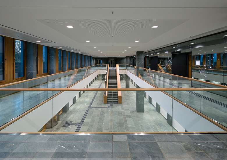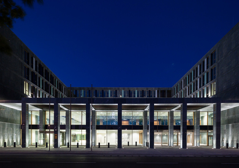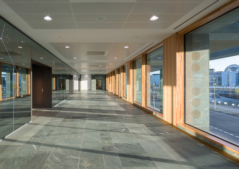 Ein nachhaltiger Stadtbaustein – Die prägnante architektonische Gestaltung des Neubaus orientiert sich am Leitbild der Spreebogenbebauung. Der Solitär beruhigt als Bindeglied der Uferbebauung das heterogene städtische Umfeld mit seiner durchgehenden Trauflinie und der klaren Fassadenstruktur. Der Eingangsbereich wird durch eine Staffelung von öffentlichem, halböffentlichem und privatem Raum definiert. Im Inneren steht die Aufenthaltsqualität der Büros im Vordergrund. Die brüstungsfreie Fassade ermöglicht einen freien Blick vom Schreibtisch aus in den Stadtraum.