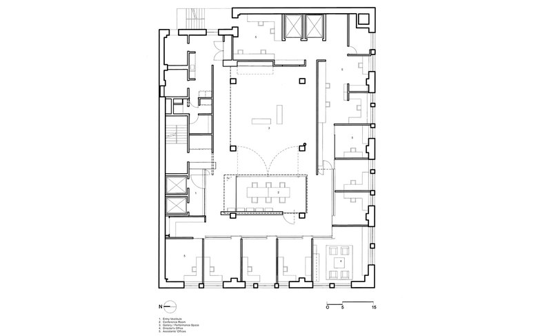 The first space one faces on entering A.I. is the stage that doubles as a conference room. The stage is a box within a box inside a box. The plan of A.I. shows a gallery that doubles as a performance space and sits within a larger box, which houses the administrative offices. Between these two spaces is the conference room / stage, a third box floating in the space in between. The stage is a minimally delineated box with a floating ceiling supported by a one-foot thick maple wall. The wood wall supports the ceiling and is covered by a grid of thirty inch by thirty inch by sixteen inch deep steel boxes.