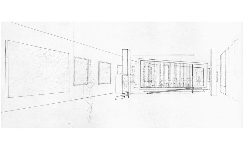 A white silk curtain makes an edge to the gallery so that it’s possible to walk around this space without interrupting performances. The curtain adds softness to a project that is otherwise uncompromising in its adherence to hard geometries.