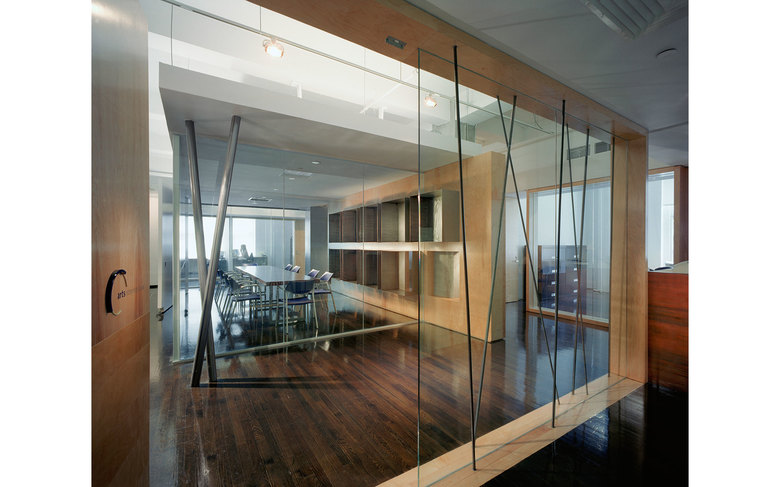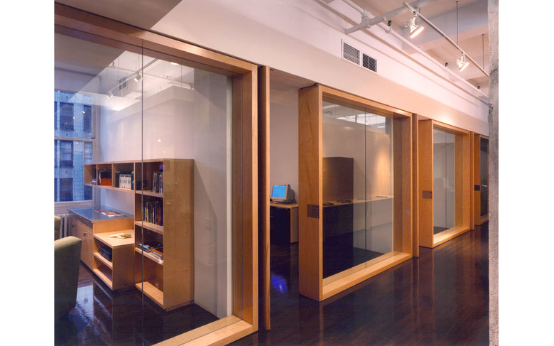 Each end elevation of the stage is clear glass. The stage is entered by a full height steel door at the end of the maple wall, facing the offices. The front plane facing the gallery is comprised of two full height panels that roll into various positions, depending on how the space is used. The offices behind the stage are delineated by one-foot thick maple framed glass openings. These deep wood frames are in active conversation with the steel boxes floating on the back wall of the stage.