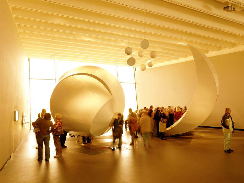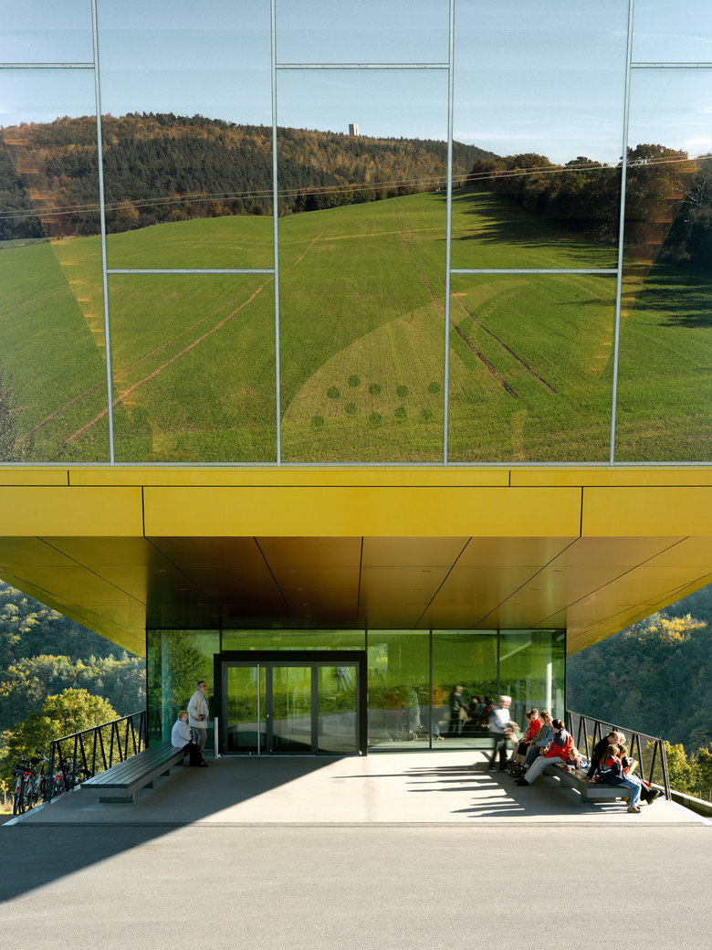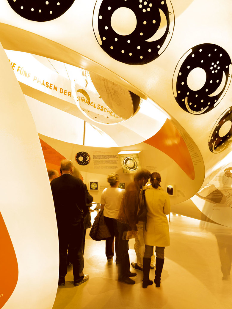 Für den Bau des Besucherzentrums wurde das Symbol der Sonnenbarke gewählt. Als schwebender Baukörper, mit einer gelb eloxierten Aluminiumfassade verkleidet, liegt sie über dem allseitig verglasten Eingangsgeschoss, in dem sich Kasse und Café befinden. Diese sechzig Meter lange, abstrahierte Barke beherbergt zwei Ausstellungsräume und das Planetarium.