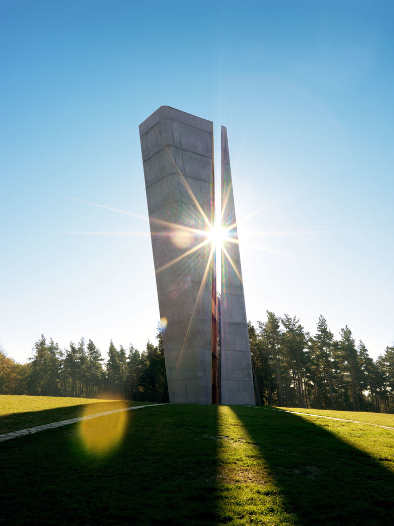 Als weithin sichtbares Zeichen markiert der dreissig Meter hohe Aussichtsturm die Fundstelle. Er ist nach oben aufgeweitet, zehn Grad gegen Norden geneigt und über seine ganze Länge aufgeschnitten, um die Sommersonnwende zu markieren. Er nimmt so das Messprinzip der Himmelsscheibe als Sonnenkalender auf. Einmal täglich scheint die Sonne durch den vertikalen Schlitz im Turm und wirft ihre Strahlen in Richtung des achtzig Kilometer entfernten Berges Brocken, dem bronzezeitlichen Orientierungspunkt zur Ausrichtung der Scheibe.