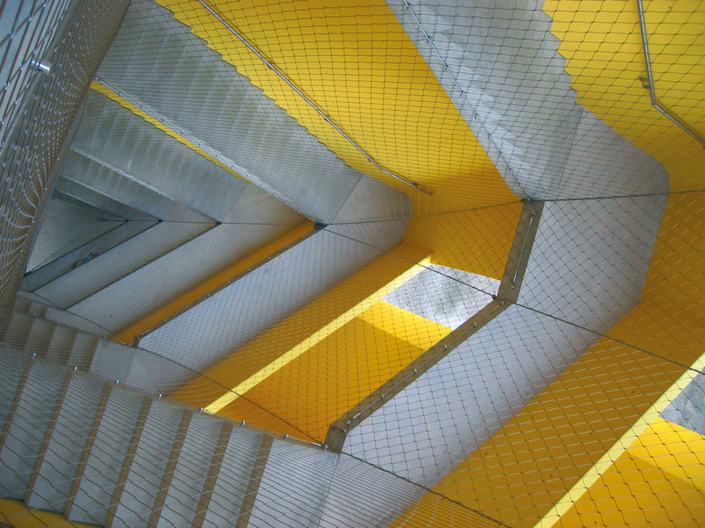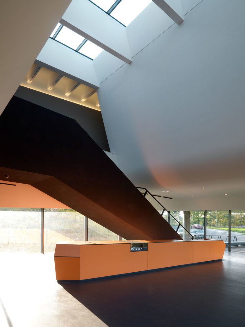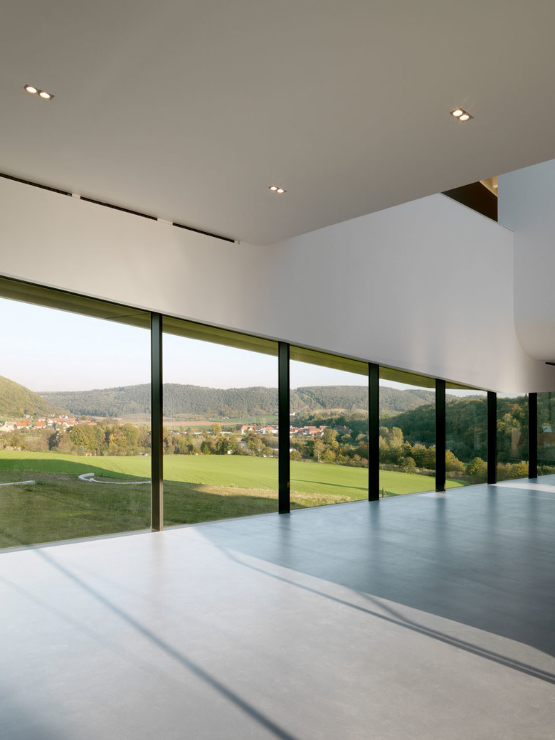 Der offene, vertikale Lichthof verbindet Erd- und Obergeschoss und stellt den Bezug zum Himmel dar. Aus dem Hang schiebt sich der grob verputzte Sockel mit Seminarräumen und Büros.