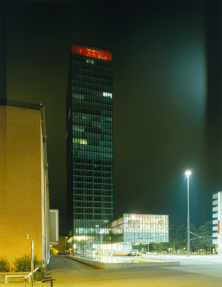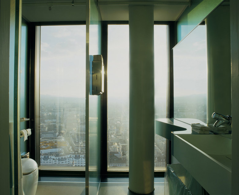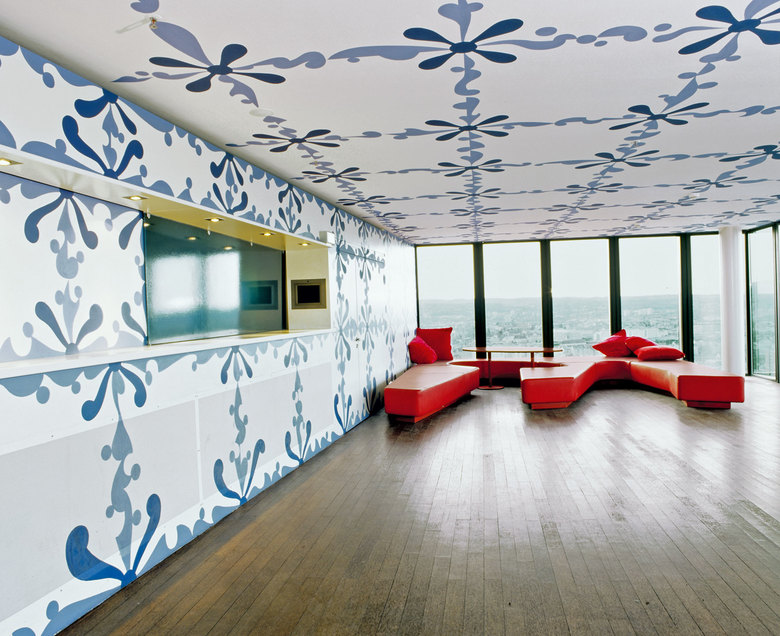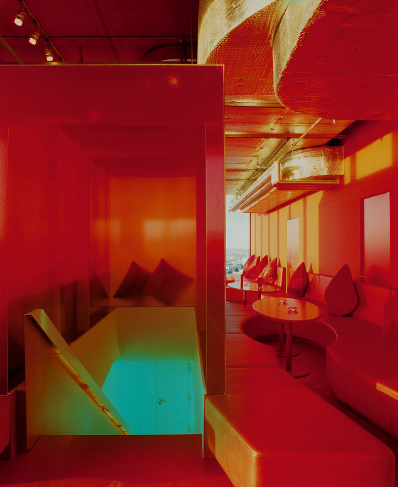 Alles ist rot – Tische, Bänke, Boden, Decke, Treppe und Bar. Bloss die Gäste und das Häusermeer von Basel, das sich vor den raumhohen Fenstern ausbreitet, heben sich vom monochromen Rot ab. Wer hierher kommt, schwebt – dem Alltagstrott entrückt – über der Stadt.
