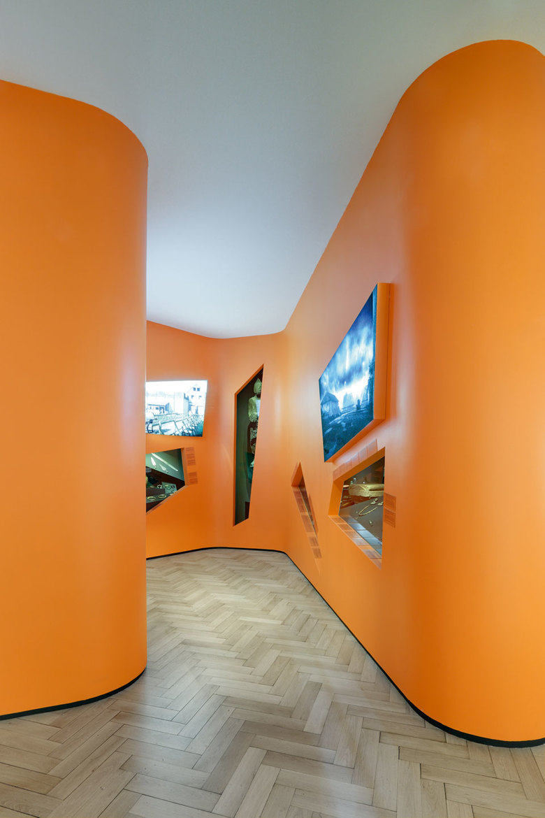 Kräftige Farbakzente verleihen den Räumen eine zum jeweiligen Thema passende Atmosphäre. Die Materialien der Einbauten sind einfach gehalten und geben den Dauerausstellungen einen provisorischen Eindruck.