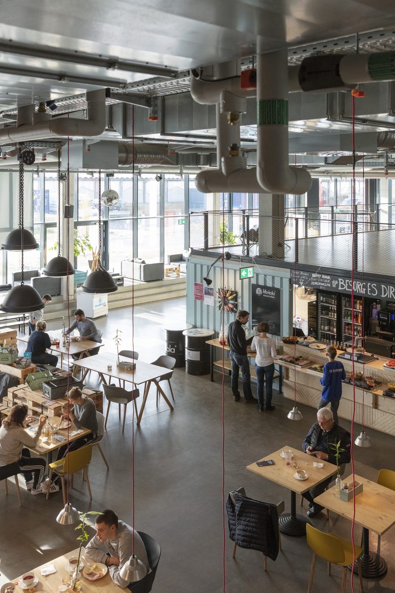 Das Hostel an Warnemündes Straße Zum Zollamt stellt mit seiner Konstruktion aus wiederverwerteten Containerboxen und seinem einzigartigen Standort an der Mole eine Verbindung zu den traditionsreichen Werftanlagen und zur offenen See her. Der Gebäudekomplex ist in zwei Teile gegliedert. Auf dem zweigeschossigen Sockelbau aus Stahl, Beton und Glas sitzt das viergeschossige Bauwerk aus recycelten, schallgedämmten Überseecontainern. Das Sockelgeschoss besteht aus einer hohen, einladenden Eingangshalle, in der ein Restaurant, eine Bar, eine Küche für Selbstversorger, Arbeitsplätze auf einer integrierten Galerie sowie eine Kletterhalle eingerichtet sind. Die Glasfront zur Straße hin bringt Tageslicht großzügig in die Räumlichkeit.