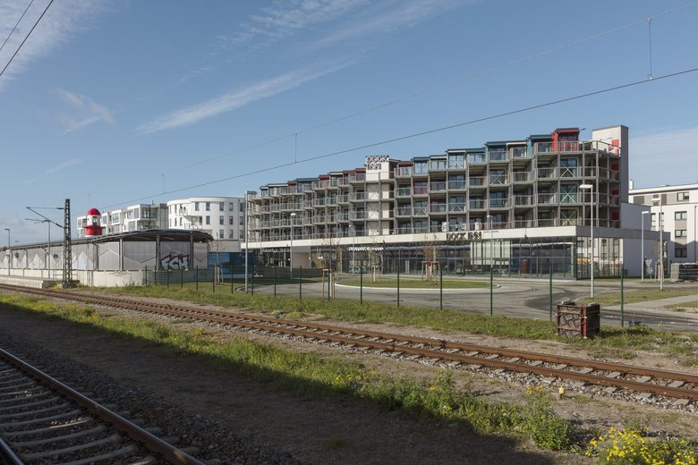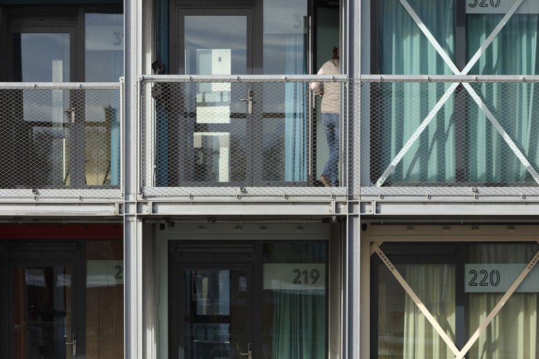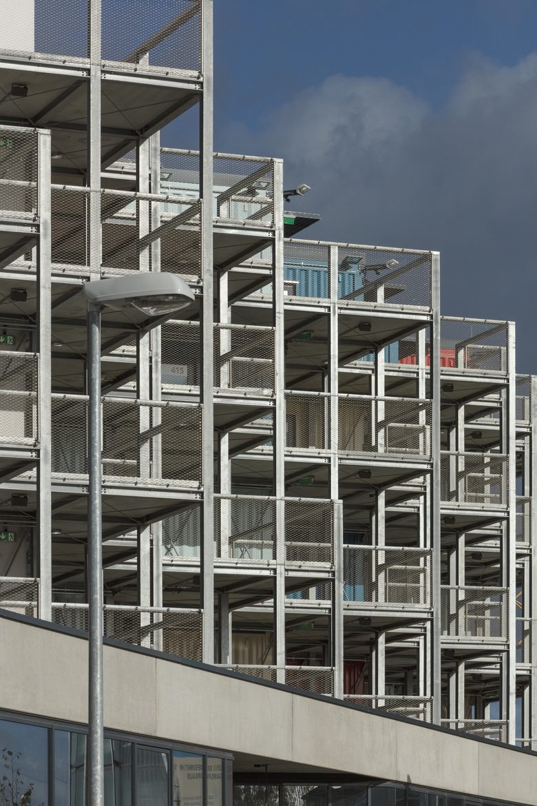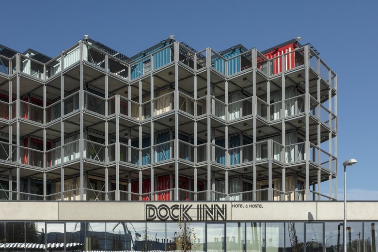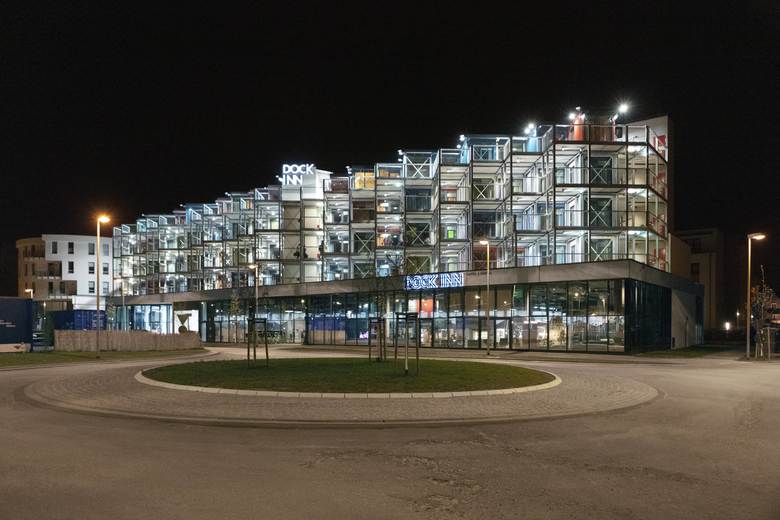 Die farbig lackierten Container-Module der vier Obergeschosse sind versetzt angeordnet und eingebettet in eine Stahl-Beton-Konstruktion. Das seriell inszenierte Äußere, die sichtbar erhaltene Containerstruktur und das leuchtende Farbenspiel, welches das maritime Umfeld aus Meer, Stränden, Werftkränen und Horizont spiegelt, präsentiert sich dabei bewusst als industriell anmutender Blickfang in der Hafenregion. Die stählernen Kojen symbolisieren ein besonderes Lebensgefühl in unserer globalisierten, nomadisch organisierten Zeit.
