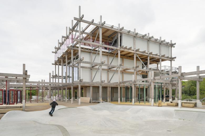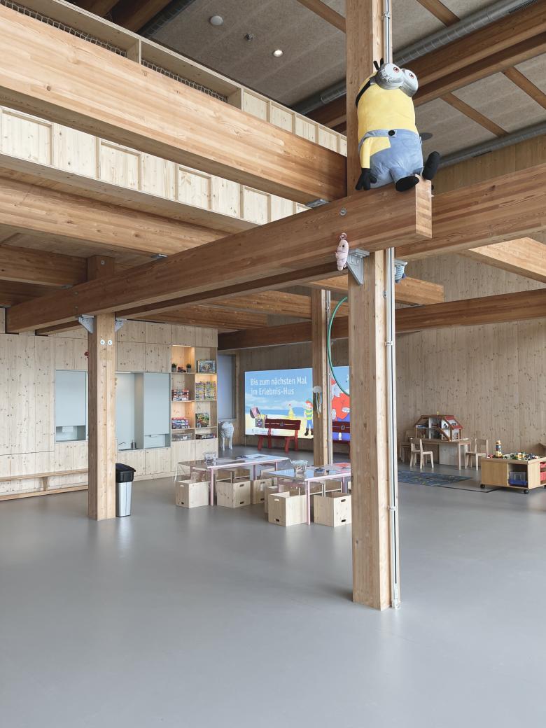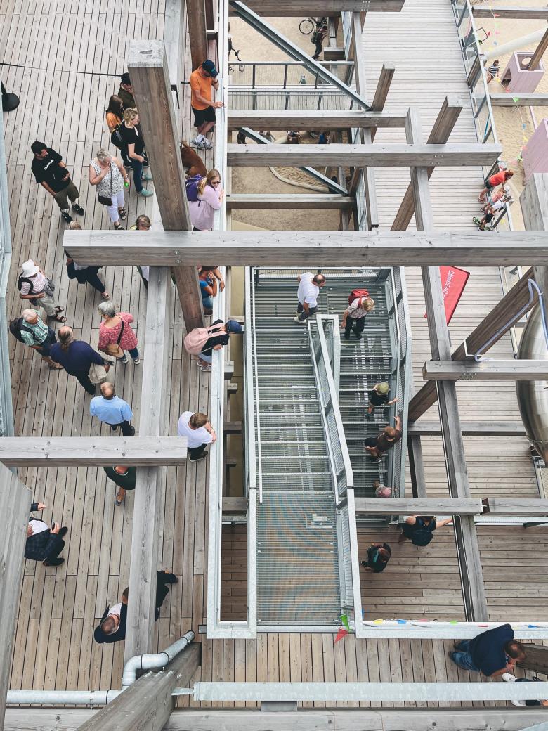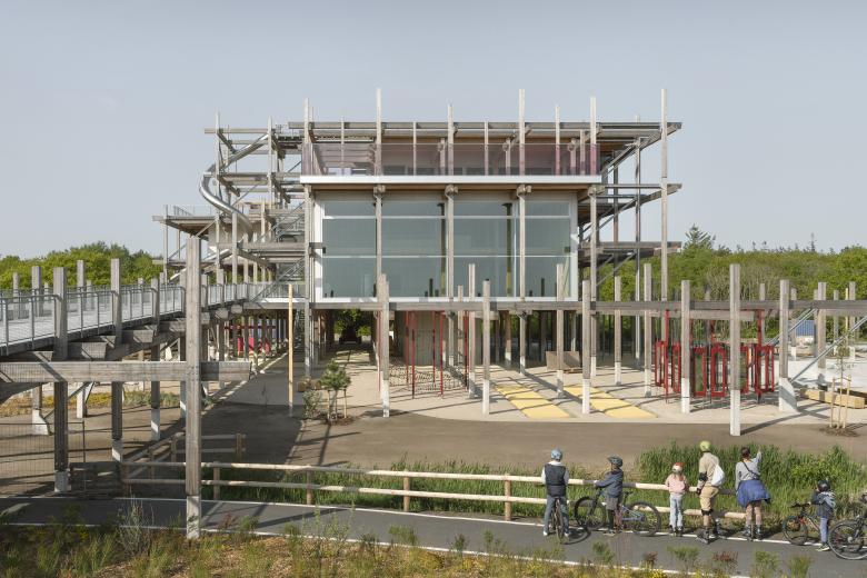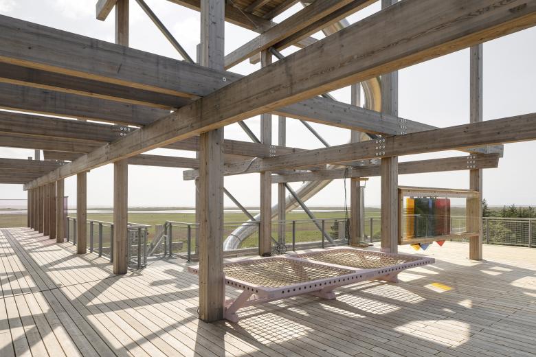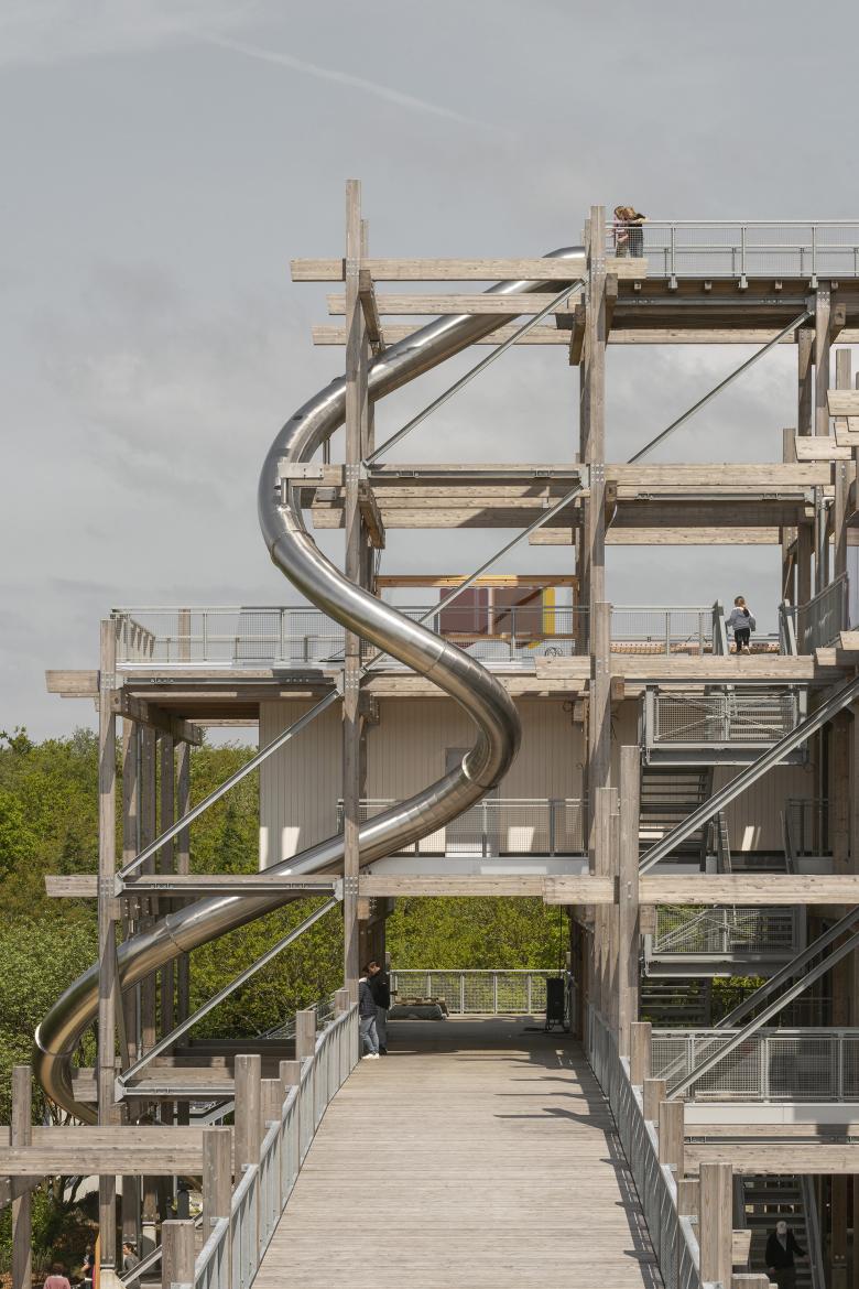 Jeder der fünf Kuben des Bauwerks hat eine eigene Funktion: In ihnen sind analoge Spielestätte, Infozentrum + Shop, Restaurant, Personalbüro und die sanitären Einrichtungen untergebracht. Die einzelnen Kuben sind dreiseitig mit einer vorgehängten Holzfassade umschlossen und öffnen sich jeweils auf einer Seite mit überdimensionalen Fenstern, die beeindruckende Ausblicke auf das Meer, das benachbarte Biotop, die Promenade und die weiter entfernte Landschaft gewähren. Eine große Zahl von Terrassen und Treppen macht das Haus zudem auf mehreren Ebenen im Außenbereich zugänglich und nutzbar, während ein Stahlbetonkern mit Aufzug und Infrastrukturräumen die emblematische Holzkonstruktion aussteift. In die Holzskulptur integrierte Spielgeräte laden die Besucher*innen zur Interaktion mit dem Gebäude ein und fordern sie zum Spielen in, auf, unter, neben und um das Haus herum auf.