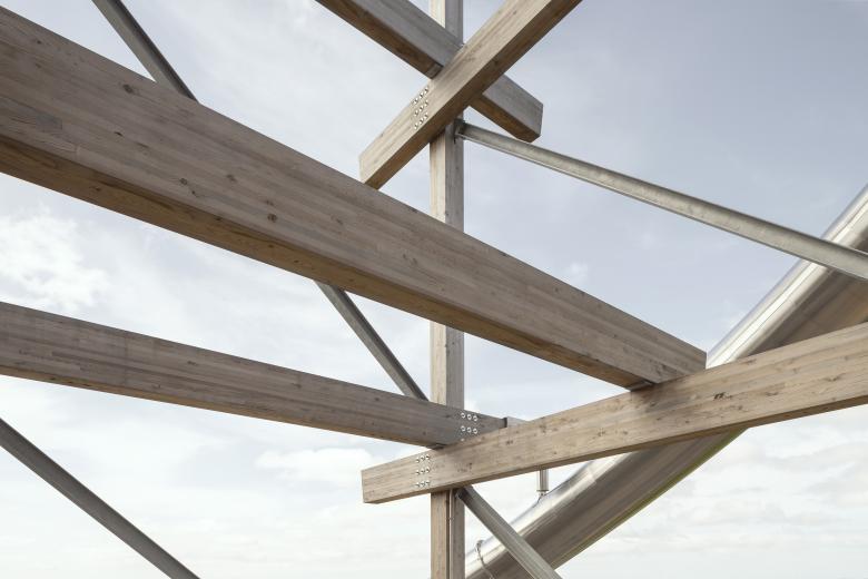Die Konstruktion orientiert sich an der ortstypischen Pfahlbauweise und interpretiert diese neu. Sie besteht aus einer frei bewitterten Stützen- und Trägermatrix aus Brettschichtholz, in der fünf überdimensionale Massivholzkuben in verschiedenen Höhen und Positionen eingeschoben sind. Die Aufgabe des Projekts bestand darin, eine nachhaltige, ökologische und touristisch wie gesellschaftlich innovative Lösung zu finden, die zur Attraktivität des Orts beiträgt.