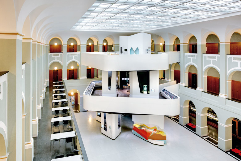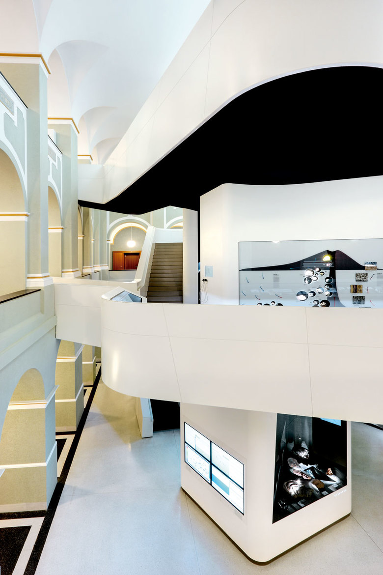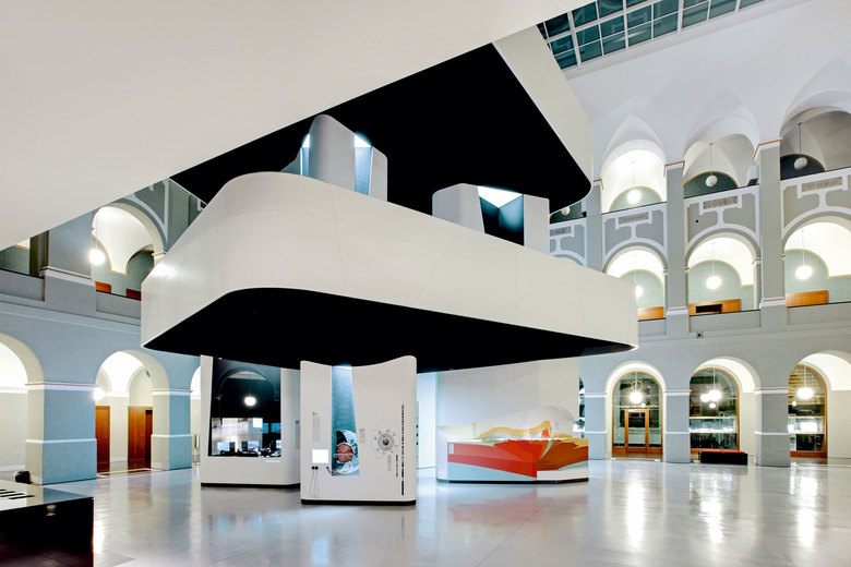 Herzstück der Ausstellung ist ein offener Ausstellungsturm im gedeckten Lichthof, der sich selbstbewusst vom neu renovierten, historischen Gebäude absetzt und einen Dialog zwischen alt und neu provoziert. In Analogie zu den Kräften, die im Inneren der Erde wirken, schraubt er sich spiralförmig über drei Geschosse bis unter die Lichtdecke des Innenhofs. Die Struktur der Ausstellung folgt jener der Schichtung der Erde. Eine um den Turm laufende Treppe und durchgehende Brüstungsbänder verbinden die drei Ebenen miteinander und führen den Besucher durch die faszinierenden „Schichten“ der Erde: von den dynamischen Prozessen (Dynamik der Erde) in ihrem Inneren, zu den unter der Oberfläche verborgenen Schätzen (Schätze der Erde) bis zu den faszinierenden Archiven (Archive der Erde), die seit unendlichen Zeiten in ihren Sedimenten konserviert sind.