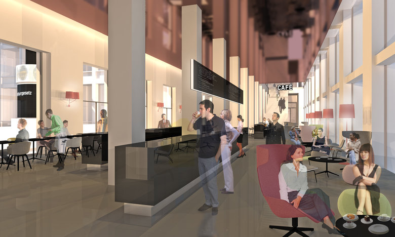 Die weitläufigen Entreezonen des Berliner Schlosses gleichen denen eines zentralen Platzes in einer Grossstadt. Die Orientierung im Gebäude folgt daher städtischen Prinzipien eines öffentlichen Raums. Durch die gute Erkennbarkeit der verschiedenen Orte und das logische, gezielt eingesetzte Leitsystem können die Menschen sich intuitiv im Raum bewegen. In der symmetrisch und repetitiv angelegten Schlossarchitektur vermittelt das bauliche Corporate Design zwischen der Dimension der Architektur und dem menschlichen Massstab.