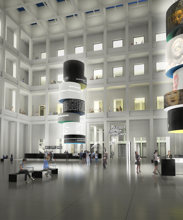 Das Humboldt-Forum im Berliner Schloss verknüpft die auf den historischen Ort bezogene Architektur mit einem zukunftsweisenden, weltoffenen Programm. Ziel des ausgeschriebenen Wettbewerbs war der Entwurf eines baulichen Corporate Design und Leitsystems für die Bücherei, das Auditorium sowie die Ausstellungsräume.