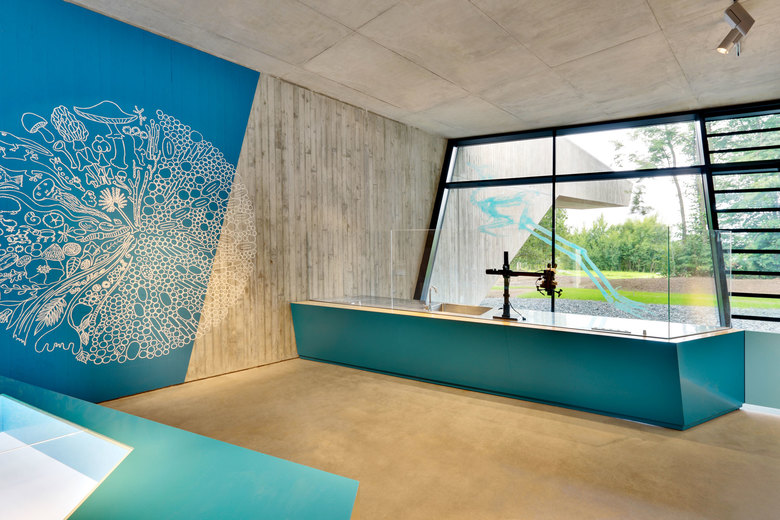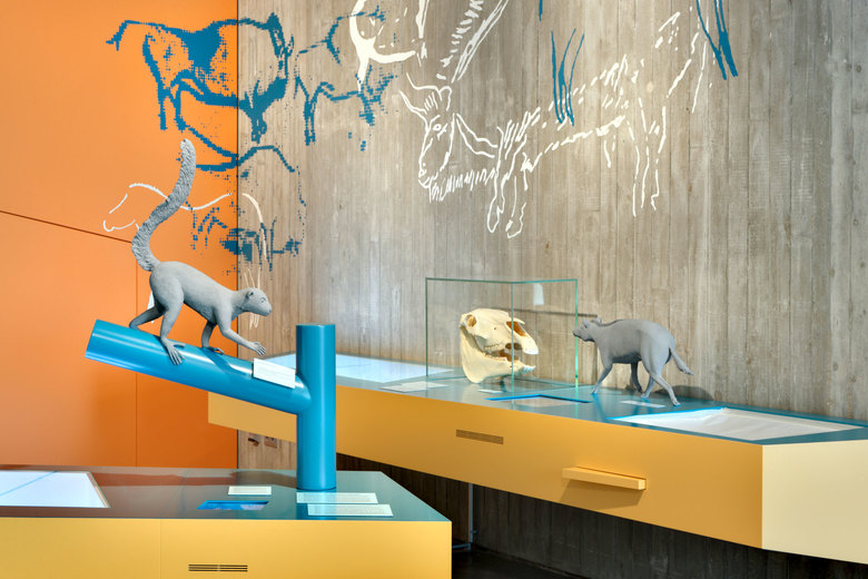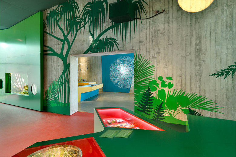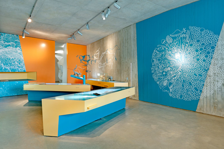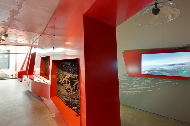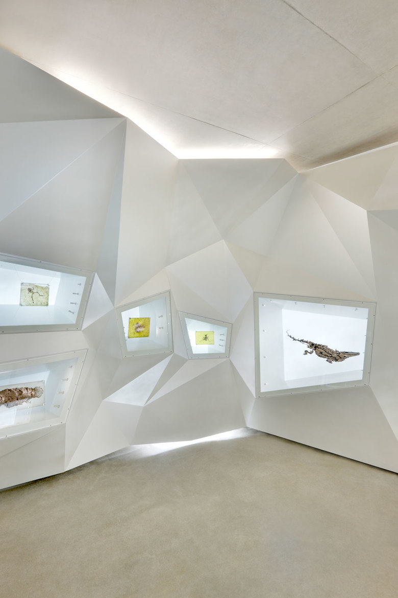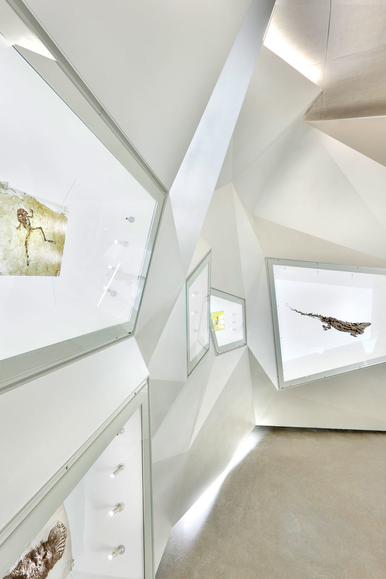 Jede der Raumschichten ist durch querlaufende Glaswände in mehrere, individuell gestaltete Ausstellungsräume unterteilt. Kristallin geformte Vitrinenkörper, gesteinsblockartige Einbauten und eine grosse, geschwungene Fläche, sind – in Analogie zu Fossilien oder Ablagerungen – zwischen den parallelen Wänden eingeklemmt. Als bunte Formen heben sich die Einbauten von der Architektur aus Sichtbeton ab.