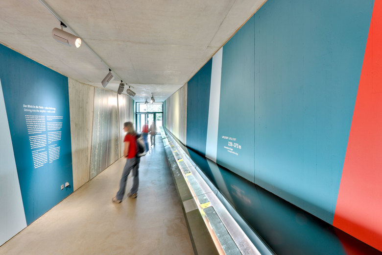 Durch eine virtuelle Fahrt in die Tiefe geht der Besucher auf eine kaleidoskopische Zeitreise in die Welt der Gesteine, entlang dem 24 Meter langen, originalen Bohrkern, der eine Reise durch die verschiedenen Gesteinsschichten – bis in die Schichten des Ölschiefers beschreibt.