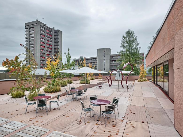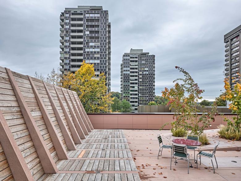 Die Architektengemeinschaft Arge Seebahn, bestehend aus illiz architektur und Simon Neuenschwander, konzipierten die Dachterrasse als sanft bewegte Landschaft aus rot eingefärbten Betonplatten, in der Wasserspielattraktionen, Sitzstufen und Liegeflächen, Sonnendecks und Pflanzbereiche fliessend ineinandergreifen. Große, neu gepflanzte Sträucher dienen als Schattenspender und flechten den Grünraum auf dem Dach in das Netzwerk der umgebenden Baumkronen.