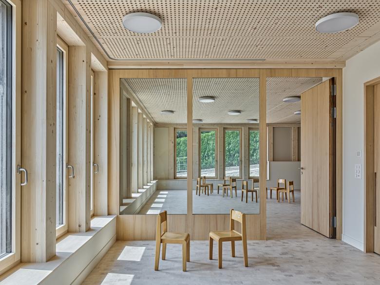 Der eingestellte Kern mit Nebenräumen zoniert den Grundriss in Kindergartenklasse, Gruppenraum und Garderobe. Es entsteht ein fließender und stützenfreier Raum, der durch große Innenverglasungen zusammenhängend erfahrbar bleibt. Durch die sichtbar belassene Holz-Tragstruktur wird die Gliederung in der Fassade auch im Inneren erfahrbar und umrahmt den offenen Grundriss mit einem gleichmäßigen Stakkato aus offenen und geschlossenen Feldern.