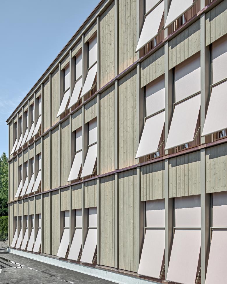 Das Gebäude wurde als Beton-Holz-Hybridbau ausgeführt: die erdberührten Wände und der zentrale Kern in Stahlbetonbauweise gewährleisten Erdbebensicherheit, Schallschutz und thermische Speichermasse. Die Gebäudehülle wird im Sinne der Nachhaltigkeit in Holzbauweise materialisiert. Vertikale Lisenen strukturieren die Fassade und zitieren das Fachwerk des abgebrochenen Bestandsgebäudes auf eine zeitgenössische Art und Weise. Der strenge Rhythmus wird durch kupferverblechte Gesimse durchbrochen, die die silbergrau vorpatinierten Holzoberflächen fein durchziehen. Hellrosa Stoffmarkisen setzen farbige Akzente und geben dem Gebäude ein wandelndes und spielerisches Erscheinungsbild.
