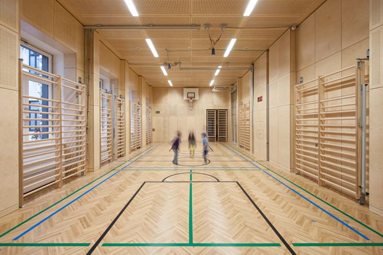 Das neue Raumkonzept sieht eine Entfernung der trennenden Elemente innerhalb der Geschosse und eine horizontale Gliederung in Hort und Volksschule vor. Durch die Neustrukturierung und die Konzentration der Garderobenflächen im Erdgeschoss werden an den Riegelenden Nutzflächen gewonnen, welche nun als Mehrzweck- und Kreativbereiche gestaltet werden können.