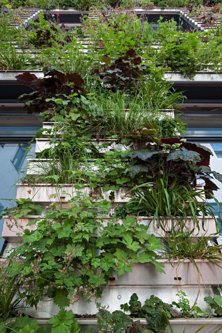 Die Farbnuancen des bestehenden Terrazzobelages werden als Grundfarbton für die Material- und Oberflächengestaltung eingesetzt, wodurch eine zurückhaltende Ton-in-Ton Gestaltung entsteht, welche das Grundgerüst für farbige Akzente mit Grün- und Blautönen bildet. Als „Hingucker“ wird das Thema „Regenbogenschule“ aufgenommen und mit vier variierenden farbigen Streifen über Hort- und Schulgeschosse aufgespannt.